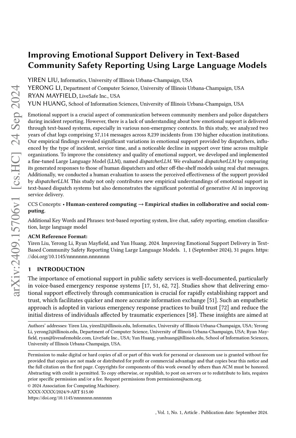 Emotional support is a crucial aspect of communication between community members and police dispatchers during incident reporting. However, there is a lack of understanding about how emotional support is delivered through text-based systems, especially in various non-emergency contexts. In this study, we analyzed two years of chat logs comprising 57,114 messages across 8,239 incidents from 130 higher education institutions. Our empirical findings revealed significant variations in emotional support provided by dispatchers, influenced by the type of incident, service time, and a noticeable decline in support over time across multiple organizations. To improve the consistency and quality of emotional support, we developed and implemented a fine-tuned Large Language Model (LLM), named dispatcherLLM. We evaluated dispatcherLLM by comparing its generated responses to those of human dispatchers and other off-the-shelf models using real chat messages. Additionally, we conducted a human evaluation to assess the perceived effectiveness of the support provided by dispatcherLLM. This study not only contributes new empirical understandings of emotional support in text-based dispatch systems but also demonstrates the significant potential of generative AI in improving service delivery.