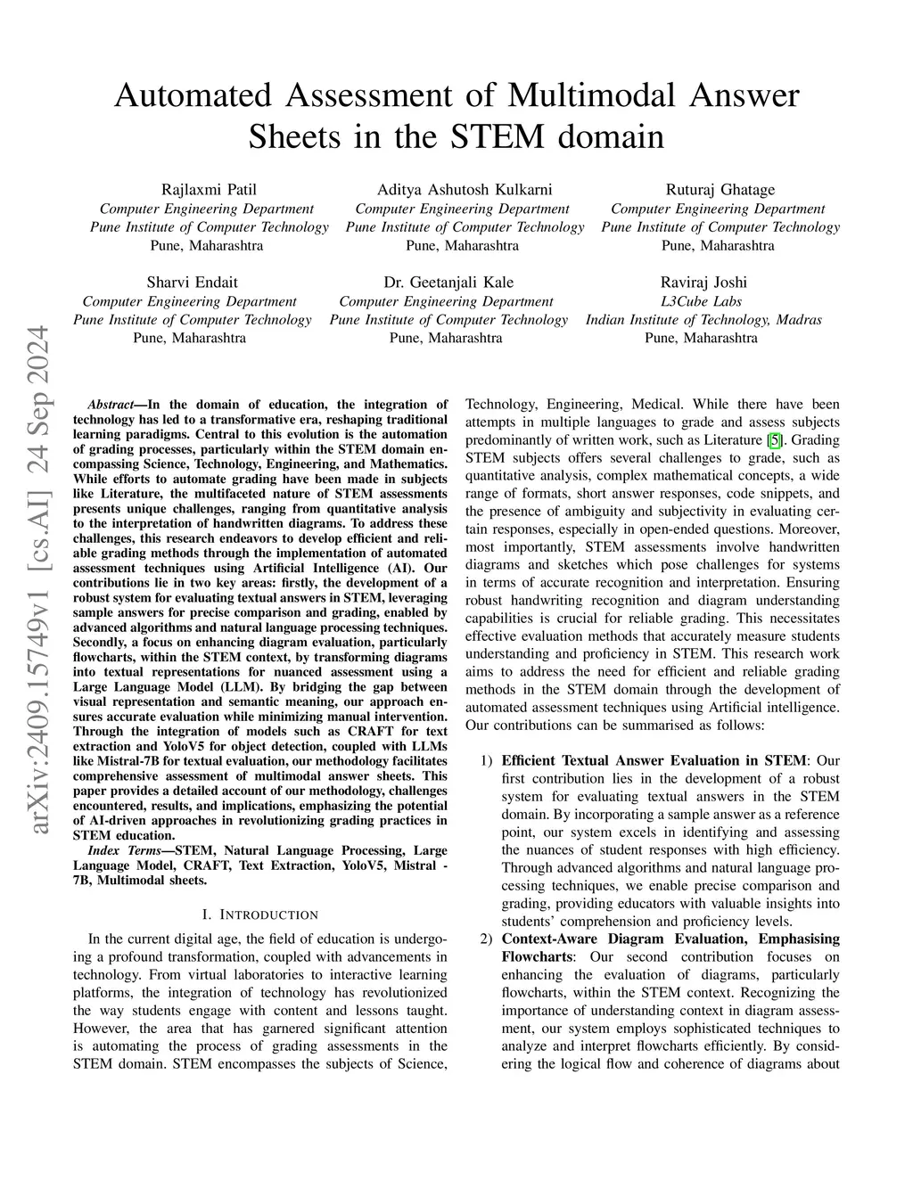 In the domain of education, the integration of,technology has led to a transformative era, reshaping traditional,learning paradigms. Central to this evolution is the automation,of grading processes, particularly within the STEM domain encompassing Science, Technology, Engineering, and Mathematics.,While efforts to automate grading have been made in subjects,like Literature, the multifaceted nature of STEM assessments,presents unique challenges, ranging from quantitative analysis,to the interpretation of handwritten diagrams. To address these,challenges, this research endeavors to develop efficient and reliable grading methods through the implementation of automated,assessment techniques using Artificial Intelligence (AI). Our,contributions lie in two key areas: firstly, the development of a,robust system for evaluating textual answers in STEM, leveraging,sample answers for precise comparison and grading, enabled by,advanced algorithms and natural language processing techniques.,Secondly, a focus on enhancing diagram evaluation, particularly,flowcharts, within the STEM context, by transforming diagrams,into textual representations for nuanced assessment using a,Large Language Model (LLM). By bridging the gap between,visual representation and semantic meaning, our approach ensures accurate evaluation while minimizing manual intervention.,Through the integration of models such as CRAFT for text,extraction and YoloV5 for object detection, coupled with LLMs,like Mistral-7B for textual evaluation, our methodology facilitates,comprehensive assessment of multimodal answer sheets. This,paper provides a detailed account of our methodology, challenges,encountered, results, and implications, emphasizing the potential,of AI-driven approaches in revolutionizing grading practices in,STEM education.