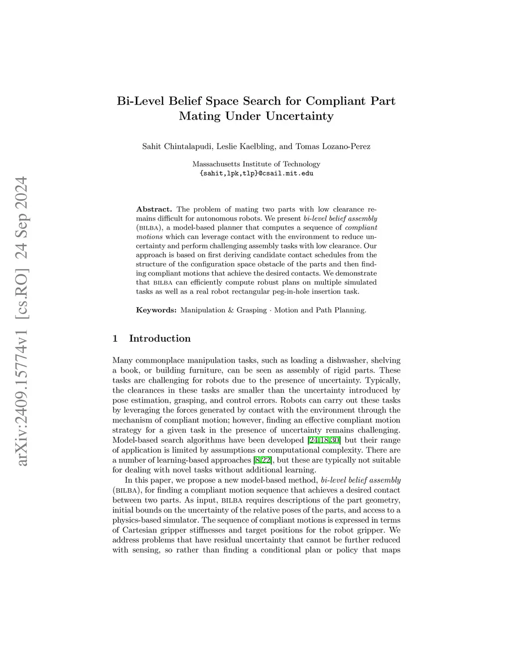 The problem of mating two parts with low clearance remains difficult for autonomous robots. We present bi-level belief assembly (BILBA), a model-based planner that computes a sequence of compliant motions which can leverage contact with the environment to reduce uncertainty and perform challenging assembly tasks with low clearance. Our approach is based on first deriving candidate contact schedules from the structure of the configuration space obstacle of the parts and then finding compliant motions that achieve the desired contacts. We demonstrate that BILBA can efficiently compute robust plans on multiple simulated tasks as well as a real robot rectangular peg-in-hole insertion task.
