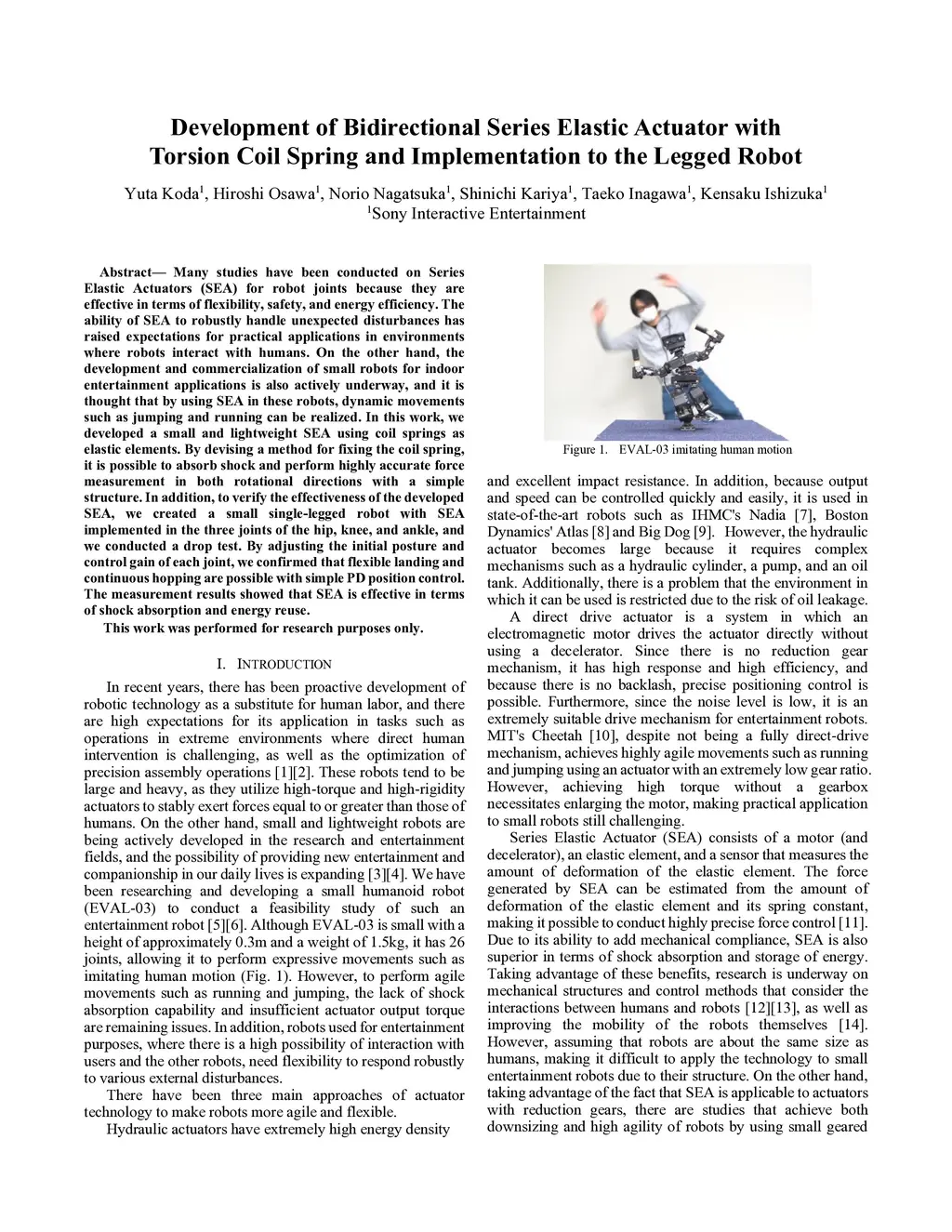Many studies have been conducted on Series Elastic Actuators (SEA) for robot joints because they are effective in terms of flexibility, safety, and energy efficiency. The ability of SEA to robustly handle unexpected disturbances has raised expectations for practical applications in environments where robots interact with humans. On the other hand, the development and commercialization of small robots for indoor entertainment applications is also actively underway, and it is thought that by using SEA in these robots, dynamic movements such as jumping and running can be realized. In this work, we developed a small and lightweight SEA using coil springs as elastic elements. By devising a method for fixing the coil spring, it is possible to absorb shock and perform highly accurate force measurement in both rotational directions with a simple structure. In addition, to verify the effectiveness of the developed SEA, we created a small single-legged robot with SEA implemented in the three joints of the hip, knee, and ankle, and we conducted a drop test. By adjusting the initial posture and control gain of each joint, we confirmed that flexible landing and continuous hopping are possible with simple PD position control. The measurement results showed that SEA is effective in terms of shock absorption and energy reuse. This work was performed for research purposes only.