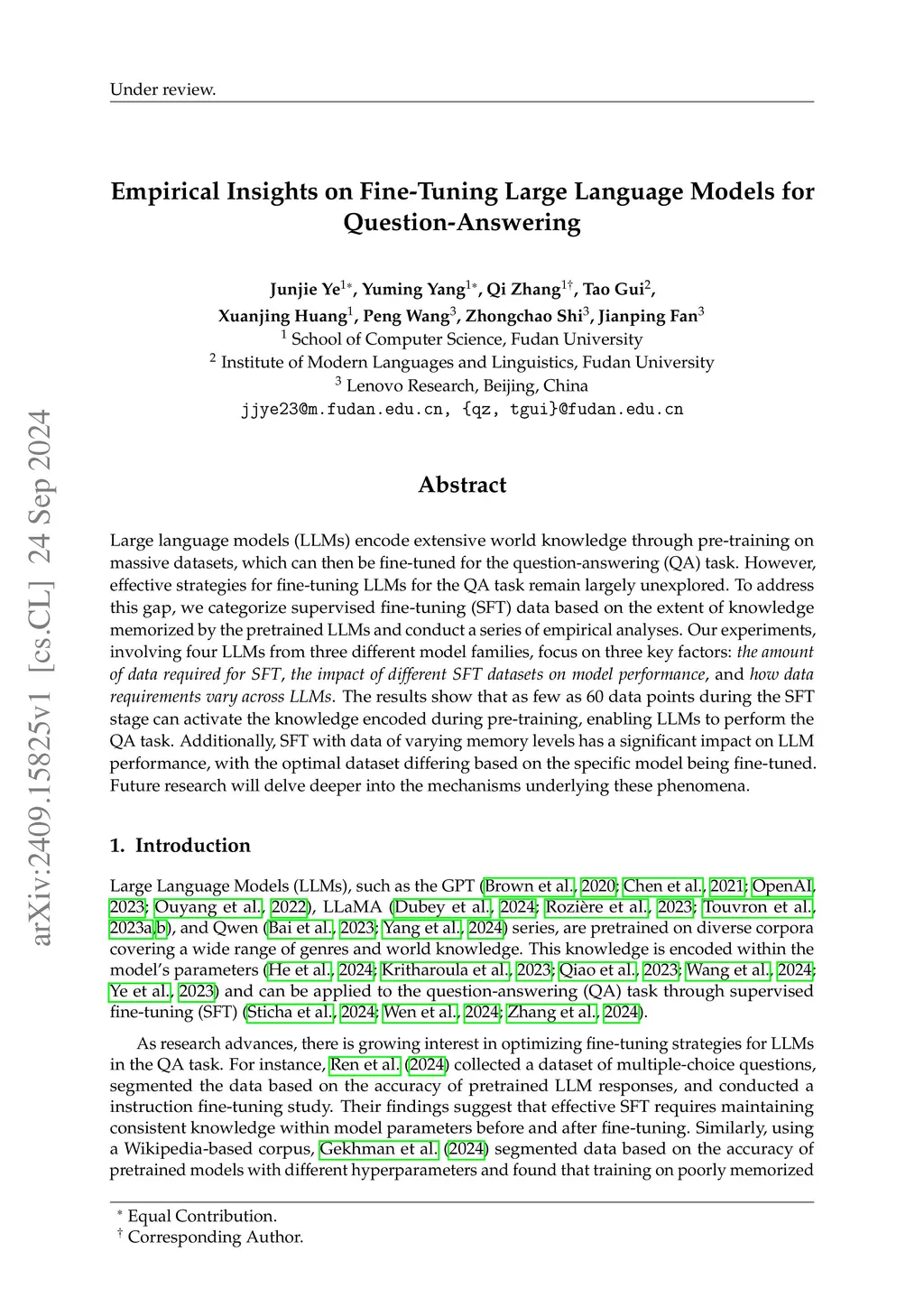 Large language models (LLMs) encode extensive world knowledge through pre-training on massive datasets, which can then be fine-tuned for the question-answering (QA) task. However, effective strategies for fine-tuning LLMs for the QA task remain largely unexplored. To address this gap, we categorize supervised fine-tuning (SFT) data based on the extent of knowledge memorized by the pretrained LLMs and conduct a series of empirical analyses. Our experiments, involving four LLMs from three different model families, focus on three key factors: the amount of data required for SFT, the impact of different SFT datasets on model performance, and how data requirements vary across LLMs. The results show that as few as 60 data points during the SFT stage can activate the knowledge encoded during pre-training, enabling LLMs to perform the QA task. Additionally, SFT with data of varying memory levels has a significant impact on LLM performance, with the optimal dataset differing based on the specific model being fine-tuned. Future research will delve deeper into the mechanisms underlying these phenomena.