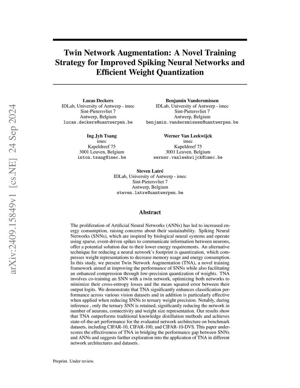The proliferation of Artificial Neural Networks (ANNs) has led to increased energy consumption, raising concerns about their sustainability. Spiking Neural Networks (SNNs), which are inspired by biological neural systems and operate using sparse, event-driven spikes to communicate information between neurons, offer a potential solution due to their lower energy requirements. An alternative technique for reducing a neural network's footprint is quantization, which compresses weight representations to decrease memory usage and energy consumption. In this study, we present Twin Network Augmentation (TNA), a novel training framework aimed at improving the performance of SNNs while also facilitating an enhanced compression through low-precision quantization of weights. TNA involves co-training an SNN with a twin network, optimizing both networks to minimize their cross-entropy losses and the mean squared error between their output logits. We demonstrate that TNA significantly enhances classification performance across various vision datasets and in addition is particularly effective when applied when reducing SNNs to ternary weight precision. Notably, during inference , only the ternary SNN is retained, significantly reducing the network in number of neurons, connectivity and weight size representation. Our results show that TNA outperforms traditional knowledge distillation methods and achieves state-of-the-art performance for the evaluated network architecture on benchmark datasets, including CIFAR-10, CIFAR-100, and CIFAR-10-DVS. This paper underscores the effectiveness of TNA in bridging the performance gap between SNNs and ANNs and suggests further exploration into the application of TNA in different network architectures and datasets.