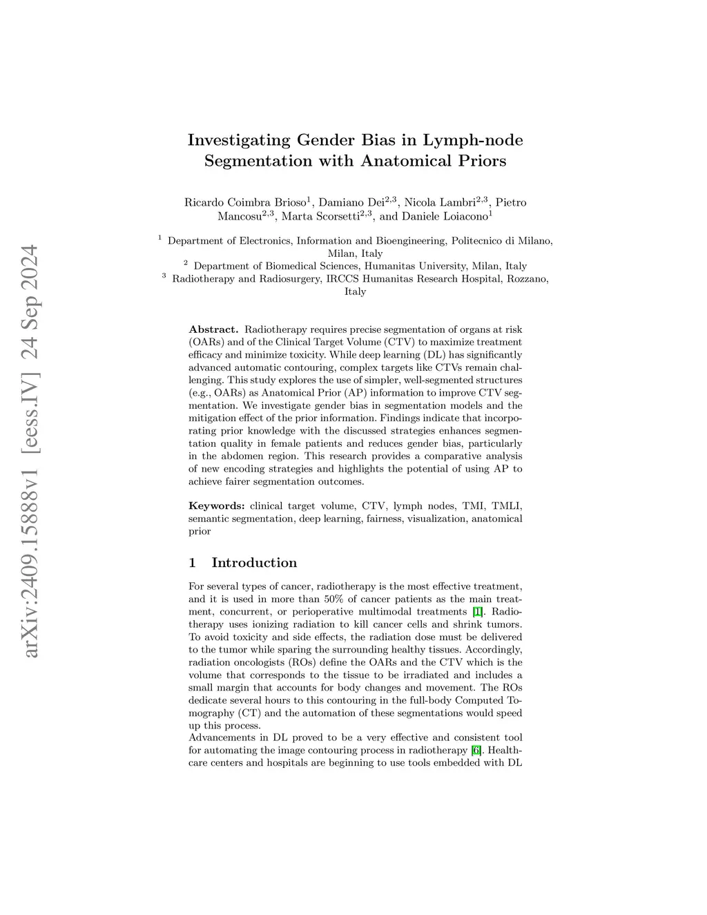 Radiotherapy requires precise segmentation of organs at risk (OARs) and of the Clinical Target Volume (CTV) to maximize treatment efficacy and minimize toxicity. While deep learning (DL) has significantly advanced automatic contouring, complex targets like CTVs remain challenging. This study explores the use of simpler, well-segmented structures (e.g., OARs) as Anatomical Prior (AP) information to improve CTV segmentation. We investigate gender bias in segmentation models and the mitigation effect of the prior information. Findings indicate that incorporating prior knowledge with the discussed strategies enhances segmentation quality in female patients and reduces gender bias, particularly in the abdomen region. This research provides a comparative analysis of new encoding strategies and highlights the potential of using AP to achieve fairer segmentation outcomes.