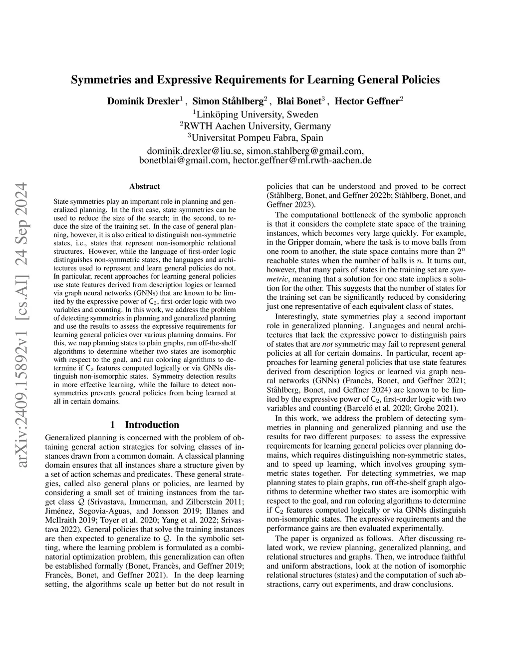 Symmetries and Expressive Requirements for Learning General Policies