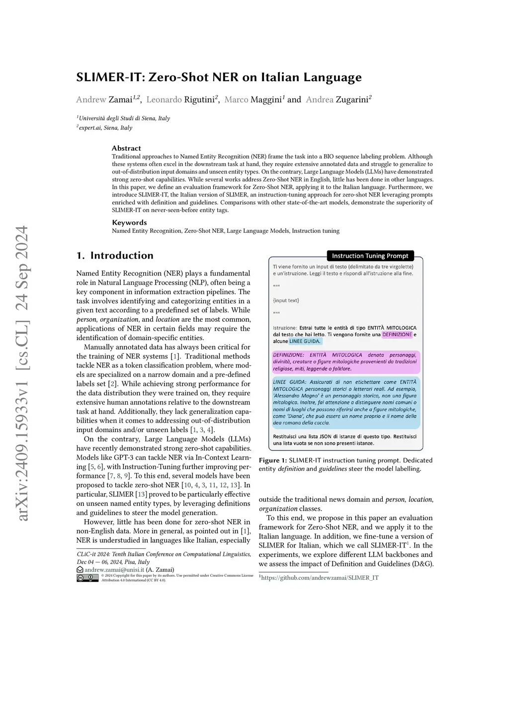Traditional approaches to Named Entity Recognition (NER) frame the task into a BIO sequence labeling problem. Although these systems often excel in the downstream task at hand, they require extensive annotated data and struggle to generalize to out-of-distribution input domains and unseen entity types. On the contrary, Large Language Models (LLMs) have demonstrated strong zero-shot capabilities. While several works address Zero-Shot NER in English, little has been done in other languages. In this paper, we define an evaluation framework for Zero-Shot NER, applying it to the Italian language. Furthermore, we introduce SLIMER-IT, the Italian version of SLIMER, an instruction-tuning approach for zero-shot NER leveraging prompts enriched with definition and guidelines. Comparisons with other state-of-the-art models, demonstrate the superiority of SLIMER-IT on never-seen-before entity tags.