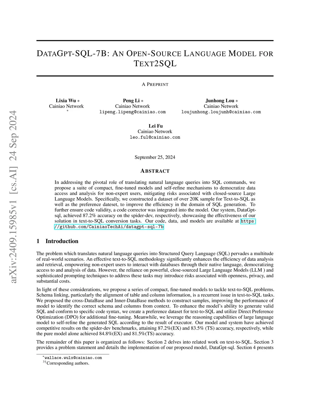 In addressing the pivotal role of translating natural language queries into SQL commands, we propose a suite of compact, fine-tuned models and self-refine mechanisms to democratize data access and analysis for non-expert users, mitigating risks associated with closed-source Large Language Models. Specifically, we constructed a dataset of over 20K sample for Text-to-SQL as well as the preference dateset, to improve the efficiency in the domain of SQL generation. To further ensure code validity, a code corrector was integrated into the model. Our system, DataGpt-sql, achieved 87.2\% accuracy on the spider-dev, respectively, showcasing the effectiveness of our solution in text-to-SQL conversion tasks. Our code, data, and models are available at \url{https://github.com/CainiaoTechAi/datagpt-sql-7b}