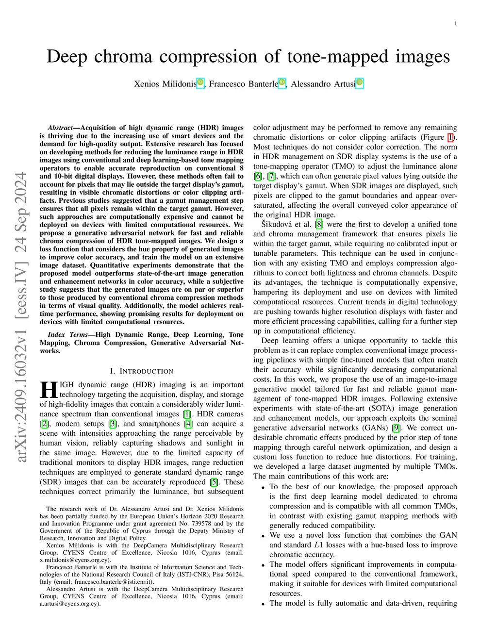 Acquisition of high dynamic range (HDR) images is thriving due to the increasing use of smart devices and the demand for high-quality output. Extensive research has focused on developing methods for reducing the luminance range in HDR images using conventional and deep learning-based tone mapping operators to enable accurate reproduction on conventional 8 and 10-bit digital displays. However, these methods often fail to account for pixels that may lie outside the target display's gamut, resulting in visible chromatic distortions or color clipping artifacts. Previous studies suggested that a gamut management step ensures that all pixels remain within the target gamut. However, such approaches are computationally expensive and cannot be deployed on devices with limited computational resources. We propose a generative adversarial network for fast and reliable chroma compression of HDR tone-mapped images. We design a loss function that considers the hue property of generated images to improve color accuracy, and train the model on an extensive image dataset. Quantitative experiments demonstrate that the proposed model outperforms state-of-the-art image generation and enhancement networks in color accuracy, while a subjective study suggests that the generated images are on par or superior to those produced by conventional chroma compression methods in terms of visual quality. Additionally, the model achieves real-time performance, showing promising results for deployment on devices with limited computational resources.