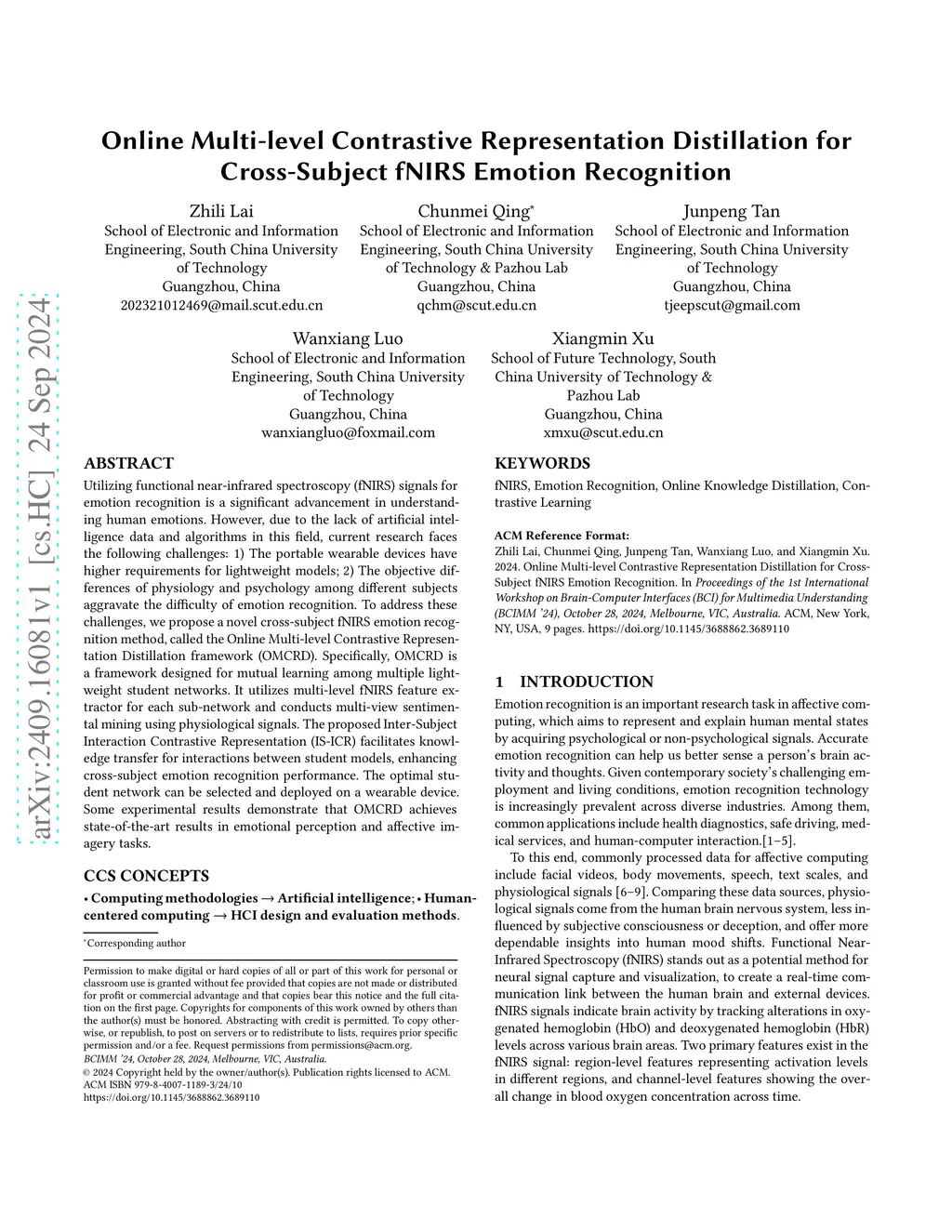 Utilizing functional near-infrared spectroscopy (fNIRS) signals for emotion recognition is a significant advancement in understanding human emotions. However, due to the lack of artificial intelligence data and algorithms in this field, current research faces the following challenges: 1) The portable wearable devices have higher requirements for lightweight models; 2) The objective differences of physiology and psychology among different subjects aggravate the difficulty of emotion recognition. To address these challenges, we propose a novel cross-subject fNIRS emotion recognition method, called the Online Multi-level Contrastive Representation Distillation framework (OMCRD). Specifically, OMCRD is a framework designed for mutual learning among multiple lightweight student networks. It utilizes multi-level fNIRS feature extractor for each sub-network and conducts multi-view sentimental mining using physiological signals. The proposed Inter-Subject Interaction Contrastive Representation (IS-ICR) facilitates knowledge transfer for interactions between student models, enhancing cross-subject emotion recognition performance. The optimal student network can be selected and deployed on a wearable device. Some experimental results demonstrate that OMCRD achieves state-of-the-art results in emotional perception and affective imagery tasks.