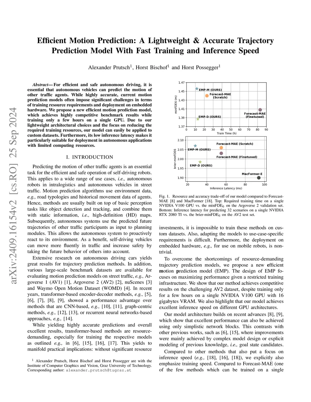 For efficient and safe autonomous driving, it is essential that autonomous vehicles can predict the motion of other traffic agents. While highly accurate, current motion prediction models often impose significant challenges in terms of training resource requirements and deployment on embedded hardware. We propose a new efficient motion prediction model, which achieves highly competitive benchmark results while training only a few hours on a single GPU. Due to our lightweight architectural choices and the focus on reducing the required training resources, our model can easily be applied to custom datasets. Furthermore, its low inference latency makes it particularly suitable for deployment in autonomous applications with limited computing resources.
