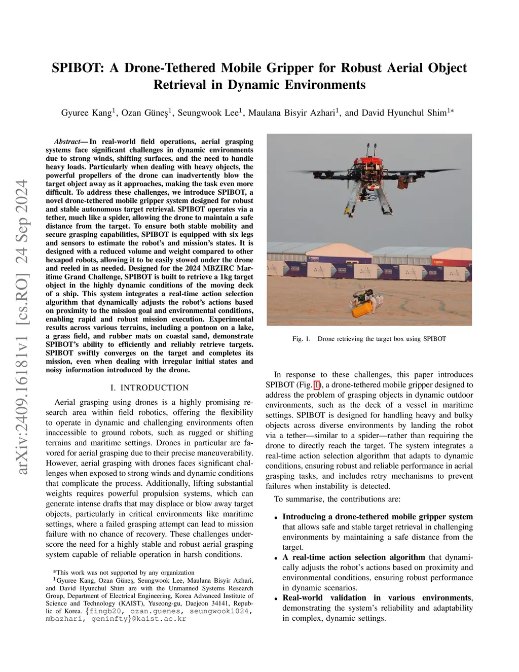In real-world field operations, aerial grasping systems face significant challenges in dynamic environments due to strong winds, shifting surfaces, and the need to handle heavy loads. Particularly when dealing with heavy objects, the powerful propellers of the drone can inadvertently blow the target object away as it approaches, making the task even more difficult. To address these challenges, we introduce SPIBOT, a novel drone-tethered mobile gripper system designed for robust and stable autonomous target retrieval. SPIBOT operates via a tether, much like a spider, allowing the drone to maintain a safe distance from the target. To ensure both stable mobility and secure grasping capabilities, SPIBOT is equipped with six legs and sensors to estimate the robot's and mission's states. It is designed with a reduced volume and weight compared to other hexapod robots, allowing it to be easily stowed under the drone and reeled in as needed. Designed for the 2024 MBZIRC Maritime Grand Challenge, SPIBOT is built to retrieve a 1kg target object in the highly dynamic conditions of the moving deck of a ship. This system integrates a real-time action selection algorithm that dynamically adjusts the robot's actions based on proximity to the mission goal and environmental conditions, enabling rapid and robust mission execution. Experimental results across various terrains, including a pontoon on a lake, a grass field, and rubber mats on coastal sand, demonstrate SPIBOT's ability to efficiently and reliably retrieve targets. SPIBOT swiftly converges on the target and completes its mission, even when dealing with irregular initial states and noisy information introduced by the drone.