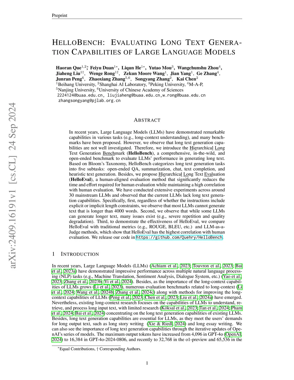 In recent years, Large Language Models (LLMs) have demonstrated remarkable capabilities in various tasks (e.g., long-context understanding), and many benchmarks have been proposed. However, we observe that long text generation capabilities are not well investigated. Therefore, we introduce the Hierarchical Long Text Generation Benchmark (HelloBench), a comprehensive, in-the-wild, and open-ended benchmark to evaluate LLMs' performance in generating long text. Based on Bloom's Taxonomy, HelloBench categorizes long text generation tasks into five subtasks: open-ended QA, summarization, chat, text completion, and heuristic text generation. Besides, we propose Hierarchical Long Text Evaluation (HelloEval), a human-aligned evaluation method that significantly reduces the time and effort required for human evaluation while maintaining a high correlation with human evaluation. We have conducted extensive experiments across around 30 mainstream LLMs and observed that the current LLMs lack long text generation capabilities. Specifically, first, regardless of whether the instructions include explicit or implicit length constraints, we observe that most LLMs cannot generate text that is longer than 4000 words. Second, we observe that while some LLMs can generate longer text, many issues exist (e.g., severe repetition and quality degradation). Third, to demonstrate the effectiveness of HelloEval, we compare HelloEval with traditional metrics (e.g., ROUGE, BLEU, etc.) and LLM-as-a-Judge methods, which show that HelloEval has the highest correlation with human evaluation. We release our code in https://github.com/Quehry/HelloBench.