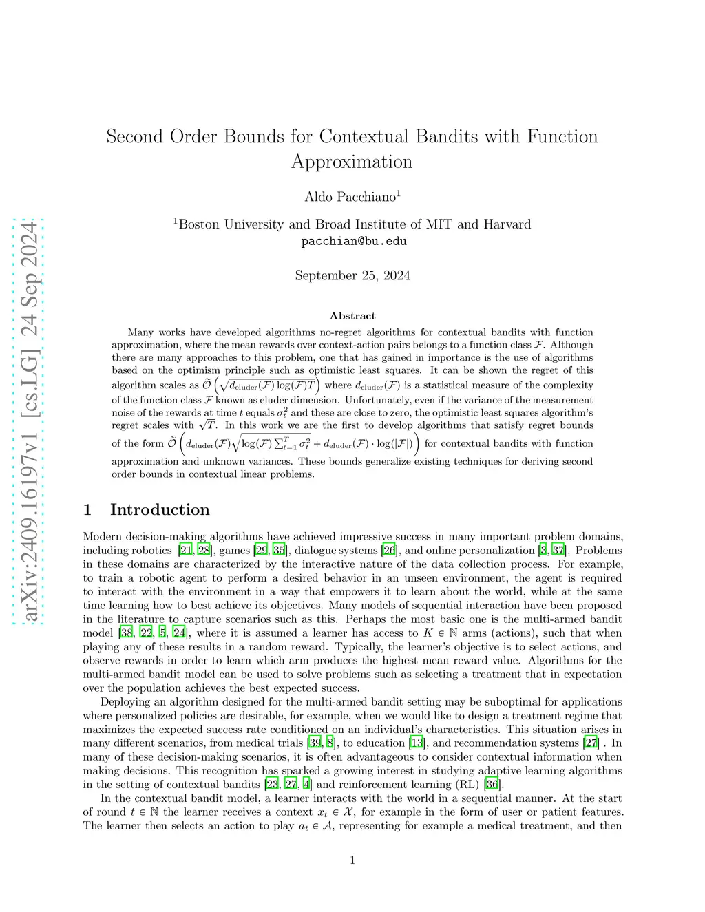 Many works have developed no-regret algorithms for contextual bandits with function approximation, where the mean reward function over context-action pairs belongs to a function class. Although there are many approaches to this problem, one that has gained in importance is the use of algorithms based on the optimism principle such as optimistic least squares. It can be shown the regret of this algorithm scales as square root of the product of the eluder dimension (a statistical measure of the complexity of the function class), the logarithm of the function class size and the time horizon. Unfortunately, even if the variance of the measurement noise of the rewards at each time is changing and is very small, the regret of the optimistic least squares algorithm scales with square root of the time horizon. In this work we are the first to develop algorithms that satisfy regret bounds of scaling not with the square root of the time horizon, but the square root of the sum of the measurement variances in the setting of contextual bandits with function approximation when the variances are unknown. These bounds generalize existing techniques for deriving second order bounds in contextual linear problems.