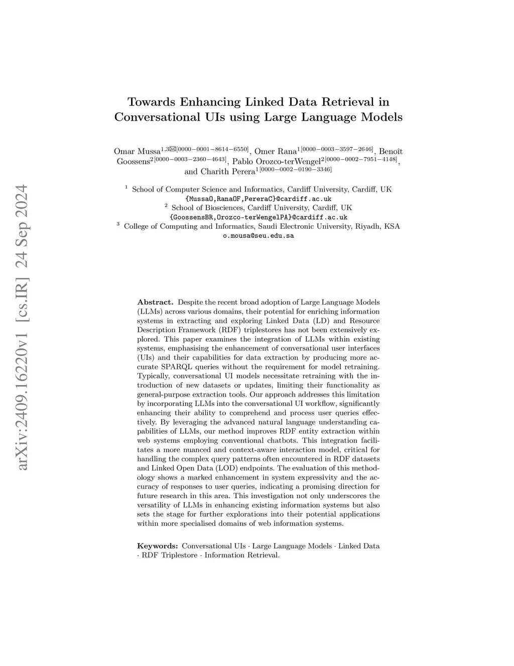 Despite the recent broad adoption of Large Language Models (LLMs) across various domains, their potential for enriching information systems in extracting and exploring Linked Data (LD) and Resource Description Framework (RDF) triplestores has not been extensively explored. This paper examines the integration of LLMs within existing systems, emphasising the enhancement of conversational user interfaces (UIs) and their capabilities for data extraction by producing more accurate SPARQL queries without the requirement for model retraining. Typically, conversational UI models necessitate retraining with the introduction of new datasets or updates, limiting their functionality as general-purpose extraction tools. Our approach addresses this limitation by incorporating LLMs into the conversational UI workflow, significantly enhancing their ability to comprehend and process user queries effectively. By leveraging the advanced natural language understanding capabilities of LLMs, our method improves RDF entity extraction within web systems employing conventional chatbots. This integration facilitates a more nuanced and context-aware interaction model, critical for handling the complex query patterns often encountered in RDF datasets and Linked Open Data (LOD) endpoints. The evaluation of this methodology shows a marked enhancement in system expressivity and the accuracy of responses to user queries, indicating a promising direction for future research in this area. This investigation not only underscores the versatility of LLMs in enhancing existing information systems but also sets the stage for further explorations into their potential applications within more specialised domains of web information systems.