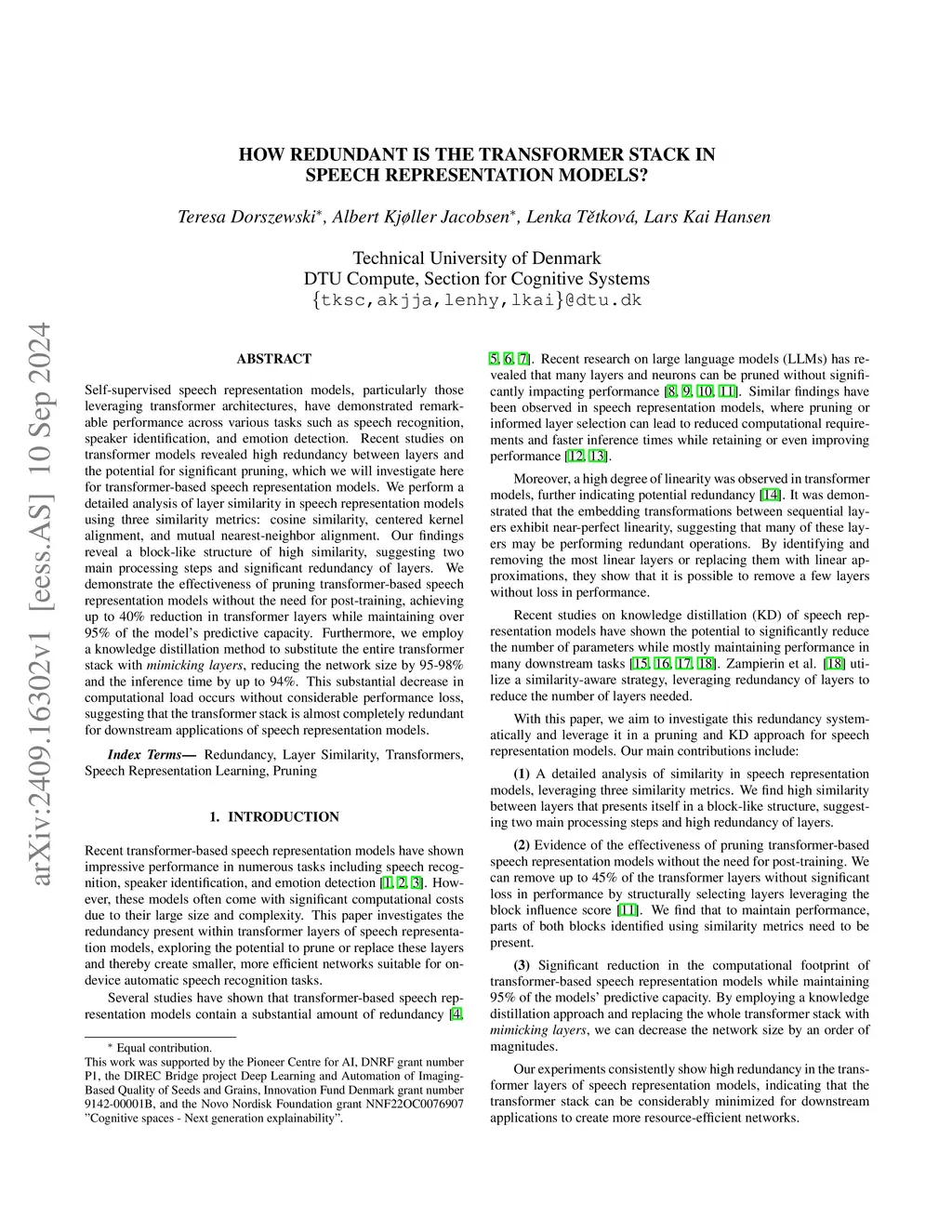 Self-supervised speech representation models, particularly those leveraging transformer architectures, have demonstrated remarkable performance across various tasks such as speech recognition, speaker identification, and emotion detection. Recent studies on transformer models revealed a high redundancy between layers and the potential for significant pruning, which we will investigate here for transformer-based speech representation models. We perform a detailed analysis of layer similarity in speech representation models using three similarity metrics: cosine similarity, centered kernel alignment, and mutual nearest-neighbor alignment. Our findings reveal a block-like structure of high similarity, suggesting two main processing steps and significant redundancy of layers. We demonstrate the effectiveness of pruning transformer-based speech representation models without the need for post-training, achieving up to 40% reduction in transformer layers while maintaining over 95% of the model's predictive capacity. Furthermore, we employ a knowledge distillation method to substitute the entire transformer stack with mimicking layers, reducing the network size 95-98% and the inference time by up to 94%. This substantial decrease in computational load occurs without considerable performance loss, suggesting that the transformer stack is almost completely redundant for downstream applications of speech representation models.
