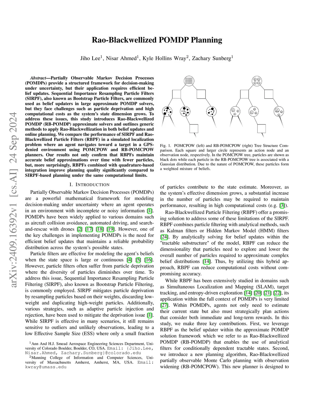 Partially Observable Markov Decision Processes (POMDPs) provide a structured framework for decision-making under uncertainty, but their application requires efficient belief updates. Sequential Importance Resampling Particle Filters (SIRPF), also known as Bootstrap Particle Filters, are commonly used as belief updaters in large approximate POMDP solvers, but they face challenges such as particle deprivation and high computational costs as the system's state dimension grows. To address these issues, this study introduces Rao-Blackwellized POMDP (RB-POMDP) approximate solvers and outlines generic methods to apply Rao-Blackwellization in both belief updates and online planning. We compare the performance of SIRPF and Rao-Blackwellized Particle Filters (RBPF) in a simulated localization problem where an agent navigates toward a target in a GPS-denied environment using POMCPOW and RB-POMCPOW planners. Our results not only confirm that RBPFs maintain accurate belief approximations over time with fewer particles, but, more surprisingly, RBPFs combined with quadrature-based integration improve planning quality significantly compared to SIRPF-based planning under the same computational limits.