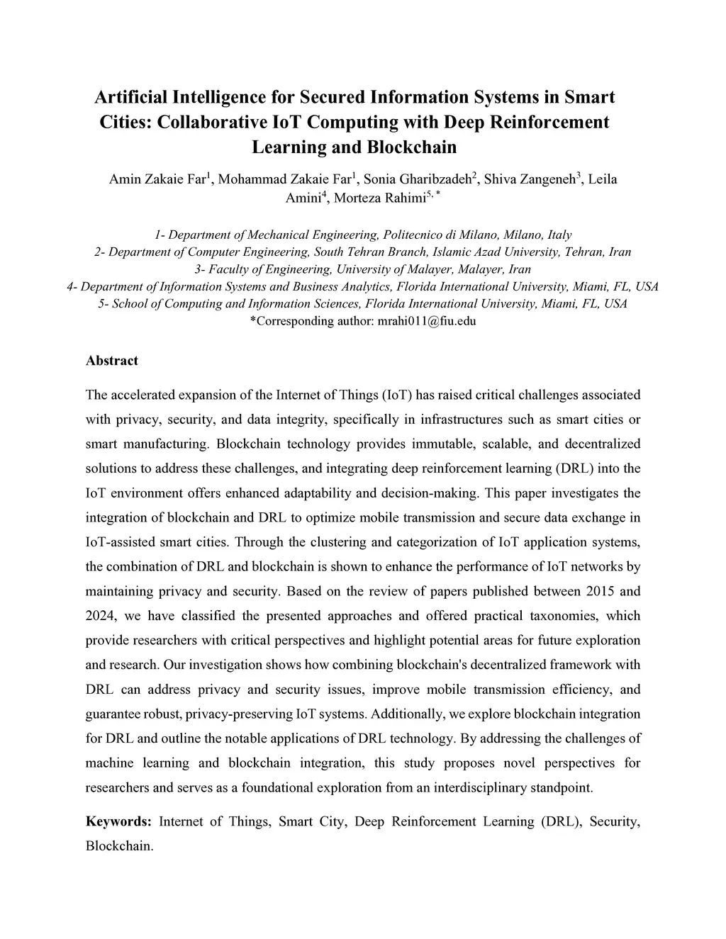 Artificial Intelligence for Secured Information Systems in Smart Cities: Collaborative IoT Computing with Deep Reinforcement Learning and Blockchain
