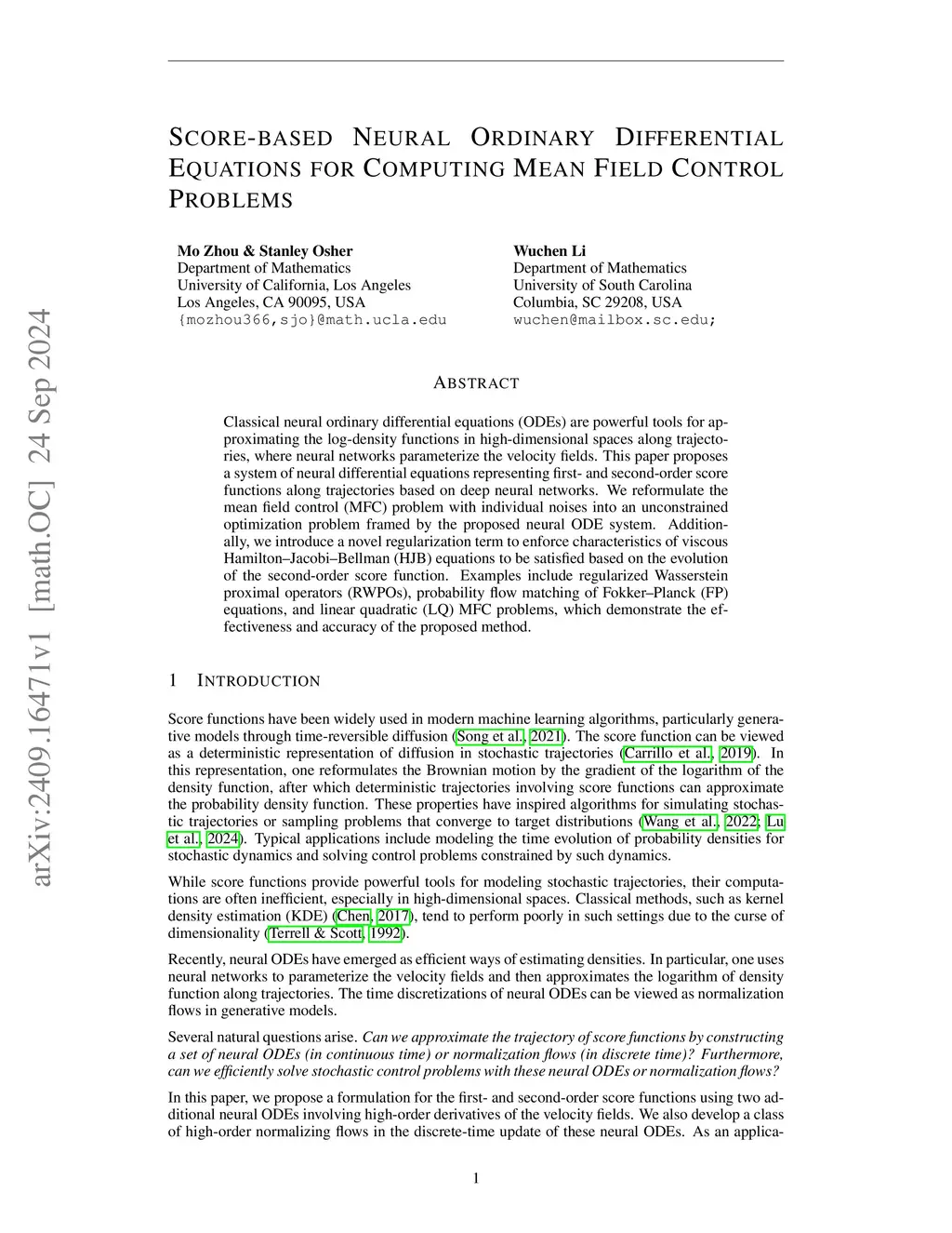 Score-based Neural Ordinary Differential Equations for Computing Mean Field Control Problems