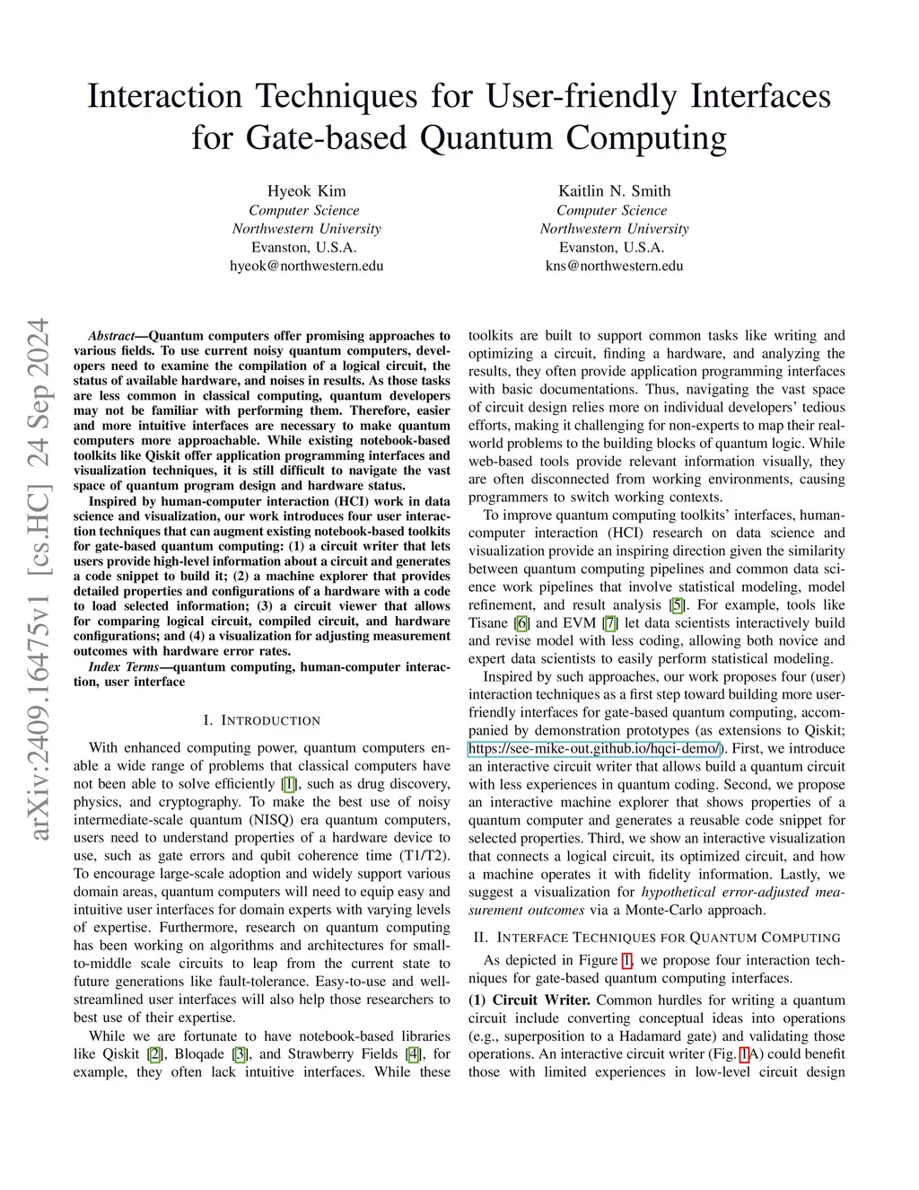 Quantum computers offer promising approaches to various fields. To use current noisy quantum computers, developers need to examine the compilation of a logical circuit, the status of available hardware, and noises in results. As those tasks are less common in classical computing, quantum developers may not be familiar with performing them. Therefore, easier and more intuitive interfaces are necessary to make quantum computers more approachable. While existing notebook-based toolkits like Qiskit offer application programming interfaces and visualization techniques, it is still difficult to navigate the vast space of quantum program design and hardware status. Inspired by human-computer interaction (HCI) work in data science and visualization, our work introduces four user interaction techniques that can augment existing notebook-based toolkits for gate-based quantum computing: (1) a circuit writer that lets users provide high-level information about a circuit and generates a code snippet to build it; (2) a machine explorer that provides detailed properties and configurations of a hardware with a code to load selected information; (3) a circuit viewer that allows for comparing logical circuit, compiled circuit, and hardware configurations; and (4) a visualization for adjusting measurement outcomes with hardware error rates.