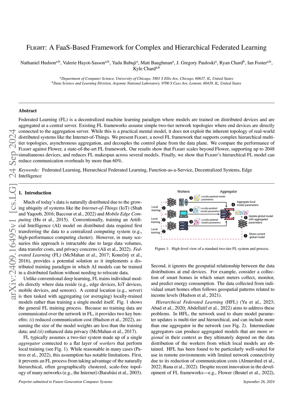 Federated Learning (FL) is a decentralized machine learning paradigm where models are trained on distributed devices and are aggregated at a central server. Existing FL frameworks assume simple two-tier network topologies where end devices are directly connected to the aggregation server. While this is a practical mental model, it does not exploit the inherent topology of real-world distributed systems like the Internet-of-Things. We present Flight, a novel FL framework that supports complex hierarchical multi-tier topologies, asynchronous aggregation, and decouples the control plane from the data plane. We compare the performance of Flight against Flower, a state-of-the-art FL framework. Our results show that Flight scales beyond Flower, supporting up to 2048 simultaneous devices, and reduces FL makespan across several models. Finally, we show that Flight's hierarchical FL model can reduce communication overheads by more than 60%.