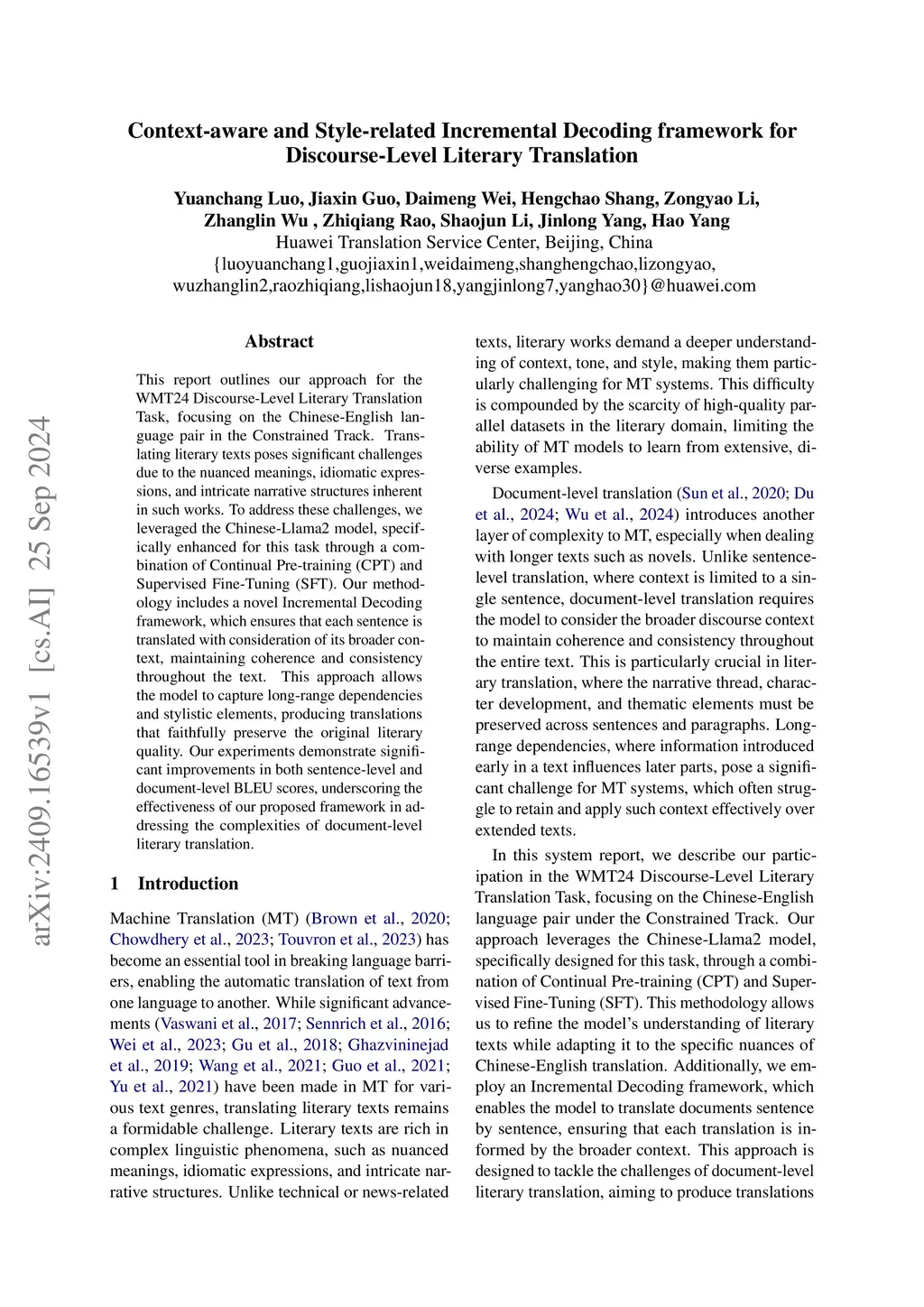 This report outlines our approach for the WMT24 Discourse-Level Literary Translation Task, focusing on the Chinese-English language pair in the Constrained Track. Translating literary texts poses significant challenges due to the nuanced meanings, idiomatic expressions, and intricate narrative structures inherent in such works. To address these challenges, we leveraged the Chinese-Llama2 model, specifically enhanced for this task through a combination of Continual Pre-training (CPT) and Supervised Fine-Tuning (SFT). Our methodology includes a novel Incremental Decoding framework, which ensures that each sentence is translated with consideration of its broader context, maintaining coherence and consistency throughout the text. This approach allows the model to capture long-range dependencies and stylistic elements, producing translations that faithfully preserve the original literary quality. Our experiments demonstrate significant improvements in both sentence-level and document-level BLEU scores, underscoring the effectiveness of our proposed framework in addressing the complexities of document-level literary translation.