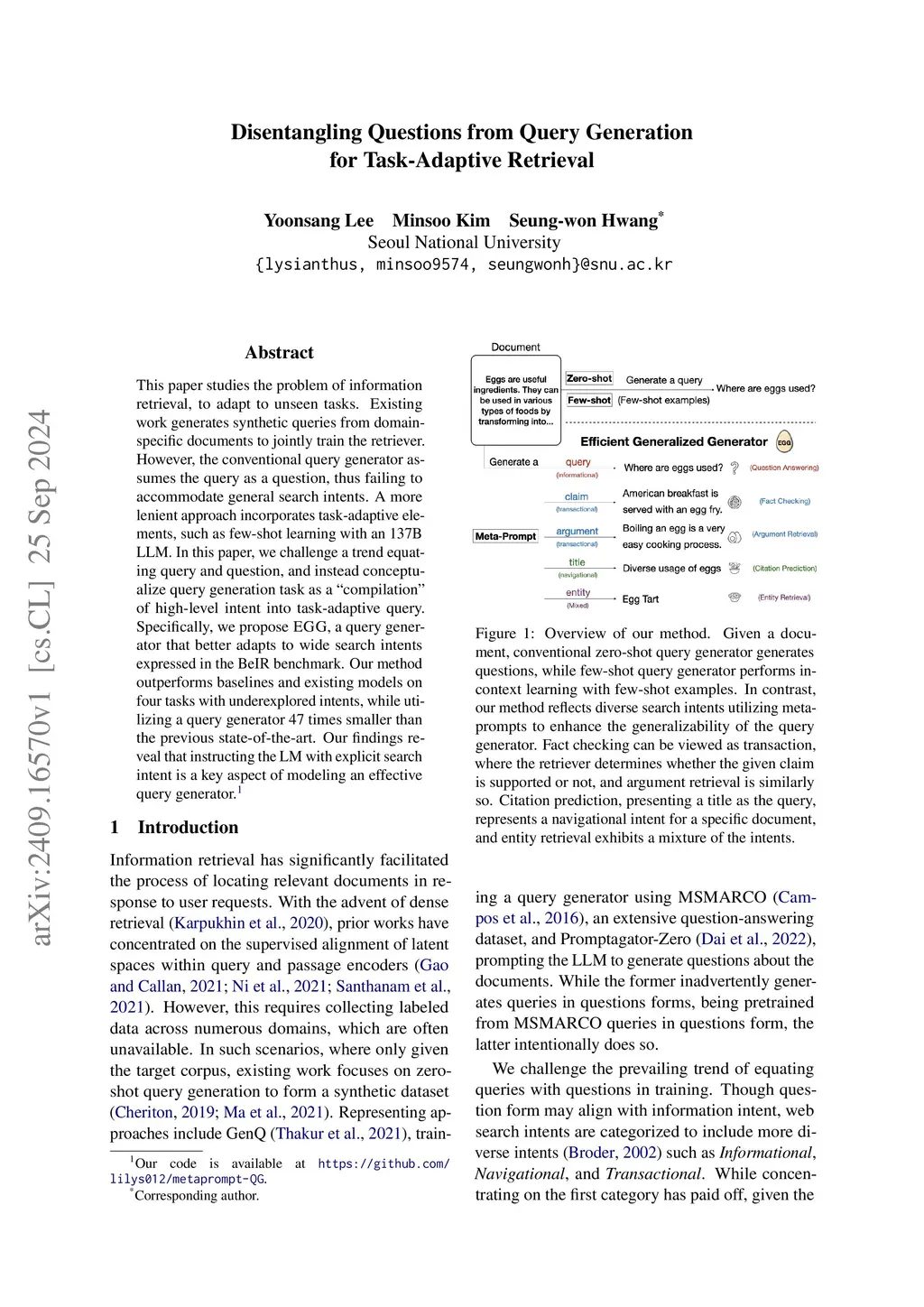 This paper studies the problem of information retrieval, to adapt to unseen tasks. Existing work generates synthetic queries from domain-specific documents to jointly train the retriever. However, the conventional query generator assumes the query as a question, thus failing to accommodate general search intents. A more lenient approach incorporates task-adaptive elements, such as few-shot learning with an 137B LLM. In this paper, we challenge a trend equating query and question, and instead conceptualize query generation task as a "compilation" of high-level intent into task-adaptive query. Specifically, we propose EGG, a query generator that better adapts to wide search intents expressed in the BeIR benchmark. Our method outperforms baselines and existing models on four tasks with underexplored intents, while utilizing a query generator 47 times smaller than the previous state-of-the-art. Our findings reveal that instructing the LM with explicit search intent is a key aspect of modeling an effective query generator.