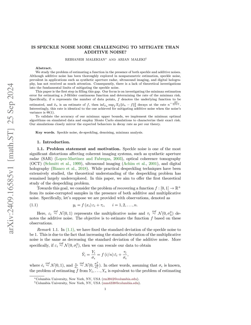 We study the problem of estimating a function in the presence of both speckle and additive noises. Although additive noise has been thoroughly explored in nonparametric estimation, speckle noise, prevalent in applications such as synthetic aperture radar, ultrasound imaging, and digital holography, has not received as much attention. Consequently, there is a lack of theoretical investigations into the fundamental limits of mitigating the speckle noise. This paper is the first step in filling this gap. Our focus is on investigating the minimax estimation error for estimating a -H\"older continuous function and determining the rate of the minimax risk. Specifically, if represents the number of data points, denotes the underlying function to be estimated, and is an estimate of , then decays at the rate . Interestingly, this rate is identical to the one achieved for mitigating additive noise when the noise's variance is . To validate the accuracy of our minimax upper bounds, we implement the minimax optimal algorithms on simulated data and employ Monte Carlo simulations to characterize their exact risk. Our simulations closely mirror the expected behaviors in decay rate as per our theory.