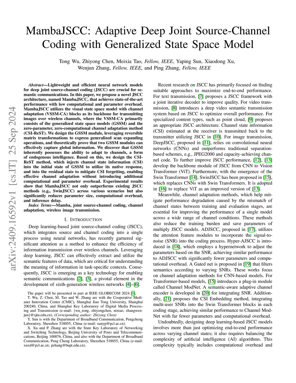 Lightweight and efficient neural network models for deep joint source-channel coding (JSCC) are crucial for semantic communications. In this paper, we propose a novel JSCC architecture, named MambaJSCC, that achieves state-of-the-art performance with low computational and parameter overhead. MambaJSCC utilizes the visual state space model with channel adaptation (VSSM-CA) blocks as its backbone for transmitting images over wireless channels, where the VSSM-CA primarily consists of the generalized state space models (GSSM) and the zero-parameter, zero-computational channel adaptation method (CSI-ReST). We design the GSSM module, leveraging reversible matrix transformations to express generalized scan expanding operations, and theoretically prove that two GSSM modules can effectively capture global information. We discover that GSSM inherently possesses the ability to adapt to channels, a form of endogenous intelligence. Based on this, we design the CSI-ReST method, which injects channel state information (CSI) into the initial state of GSSM to utilize its native response, and into the residual state to mitigate CSI forgetting, enabling effective channel adaptation without introducing additional computational and parameter overhead. Experimental results show that MambaJSCC not only outperforms existing JSCC methods (e.g., SwinJSCC) across various scenarios but also significantly reduces parameter size, computational overhead, and inference delay.