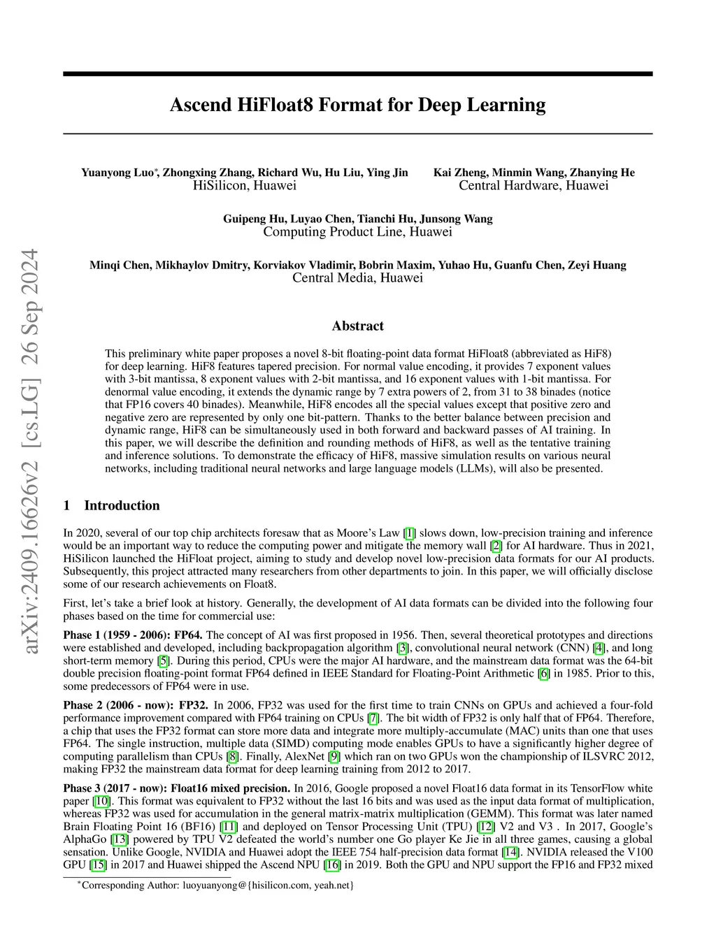 This preliminary white paper proposes a novel 8-bit floating-point data format HiFloat8 (abbreviated as HiF8) for deep learning. HiF8 features tapered precision. For normal value encoding, it provides 7 exponent values with 3-bit mantissa, 8 exponent values with 2-bit mantissa, and 16 exponent values with 1-bit mantissa. For denormal value encoding, it extends the dynamic range by 7 extra powers of 2, from 31 to 38 binades (notice that FP16 covers 40 binades). Meanwhile, HiF8 encodes all the special values except that positive zero and negative zero are represented by only one bit-pattern. Thanks to the better balance between precision and dynamic range, HiF8 can be simultaneously used in both forward and backward passes of AI training. In this paper, we will describe the definition and rounding methods of HiF8, as well as the tentative training and inference solutions. To demonstrate the efficacy of HiF8, massive simulation results on various neural networks, including traditional neural networks and large language models (LLMs), will also be presented.
