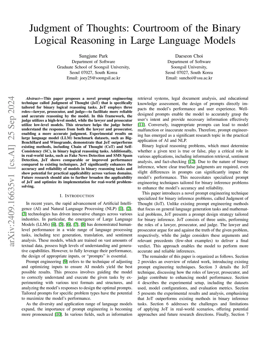 This paper proposes a novel prompting approach, Judgment of Thought (JoT), specifically tailored for binary logical reasoning tasks. Despite advances in prompt engineering, existing approaches still face limitations in handling complex logical reasoning tasks. To address these issues, JoT introduces a multi-agent approach with three specialized roleslawyer, prosecutor, and judgewhere a high-level model acts as the judge, and lower-level models serve as lawyer and prosecutor to systematically debate and evaluate arguments. Experimental evaluations on benchmarks such as BigBenchHard and Winogrande demonstrate JoT's superior performance compared to existing prompting approaches, achieving notable improvements, including 98\% accuracy in Boolean expressions. Also, our ablation studies validate the critical contribution of each role, iterative refinement loops, and feedback mechanisms. Consequently, JoT significantly enhances accuracy, reliability, and consistency in binary reasoning tasks and shows potential for practical applications.