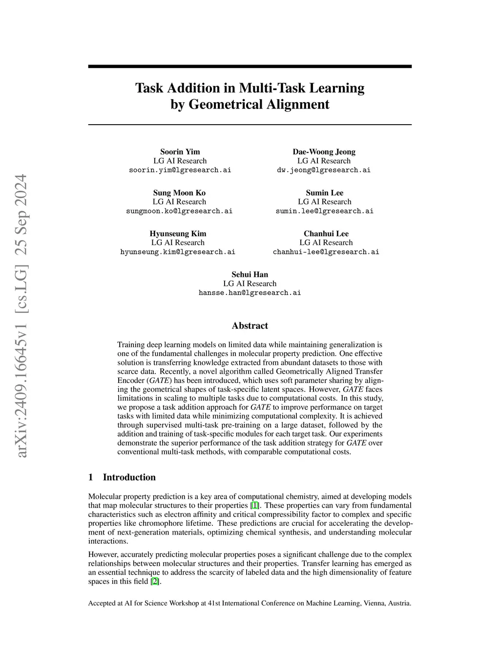Training deep learning models on limited data while maintaining generalization is one of the fundamental challenges in molecular property prediction. One effective solution is transferring knowledge extracted from abundant datasets to those with scarce data. Recently, a novel algorithm called Geometrically Aligned Transfer Encoder (GATE) has been introduced, which uses soft parameter sharing by aligning the geometrical shapes of task-specific latent spaces. However, GATE faces limitations in scaling to multiple tasks due to computational costs. In this study, we propose a task addition approach for GATE to improve performance on target tasks with limited data while minimizing computational complexity. It is achieved through supervised multi-task pre-training on a large dataset, followed by the addition and training of task-specific modules for each target task. Our experiments demonstrate the superior performance of the task addition strategy for GATE over conventional multi-task methods, with comparable computational costs.