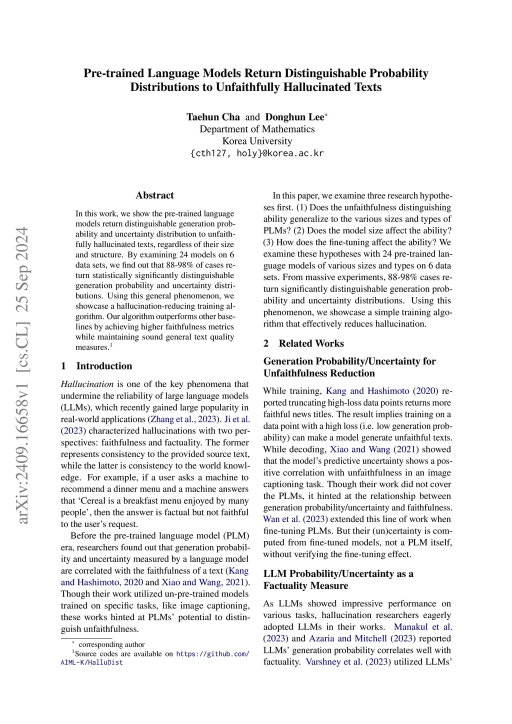 In this work, we show the pre-trained language models return distinguishable generation probability and uncertainty distribution to unfaithfully hallucinated texts, regardless of their size and structure. By examining 24 models on 6 data sets, we find out that 88-98% of cases return statistically significantly distinguishable generation probability and uncertainty distributions. Using this general phenomenon, we showcase a hallucination-reducing training algorithm. Our algorithm outperforms other baselines by achieving higher faithfulness metrics while maintaining sound general text quality measures.
