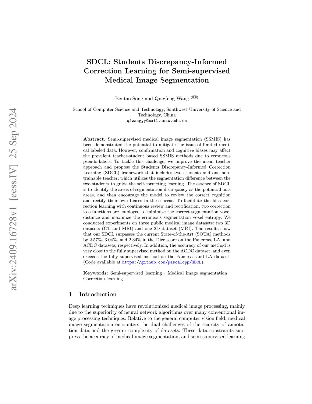Semi-supervised medical image segmentation (SSMIS) has been demonstrated the potential to mitigate the issue of limited medical labeled data. However, confirmation and cognitive biases may affect the prevalent teacher-student based SSMIS methods due to erroneous pseudo-labels. To tackle this challenge, we improve the mean teacher approach and propose the Students Discrepancy-Informed Correction Learning (SDCL) framework that includes two students and one non-trainable teacher, which utilizes the segmentation difference between the two students to guide the self-correcting learning. The essence of SDCL is to identify the areas of segmentation discrepancy as the potential bias areas, and then encourage the model to review the correct cognition and rectify their own biases in these areas. To facilitate the bias correction learning with continuous review and rectification, two correction loss functions are employed to minimize the correct segmentation voxel distance and maximize the erroneous segmentation voxel entropy. We conducted experiments on three public medical image datasets: two 3D datasets (CT and MRI) and one 2D dataset (MRI). The results show that our SDCL surpasses the current State-of-the-Art (SOTA) methods by 2.57\%, 3.04\%, and 2.34\% in the Dice score on the Pancreas, LA, and ACDC datasets, respectively. In addition, the accuracy of our method is very close to the fully supervised method on the ACDC dataset, and even exceeds the fully supervised method on the Pancreas and LA dataset. (Code available at \url{https://github.com/pascalcpp/SDCL}).