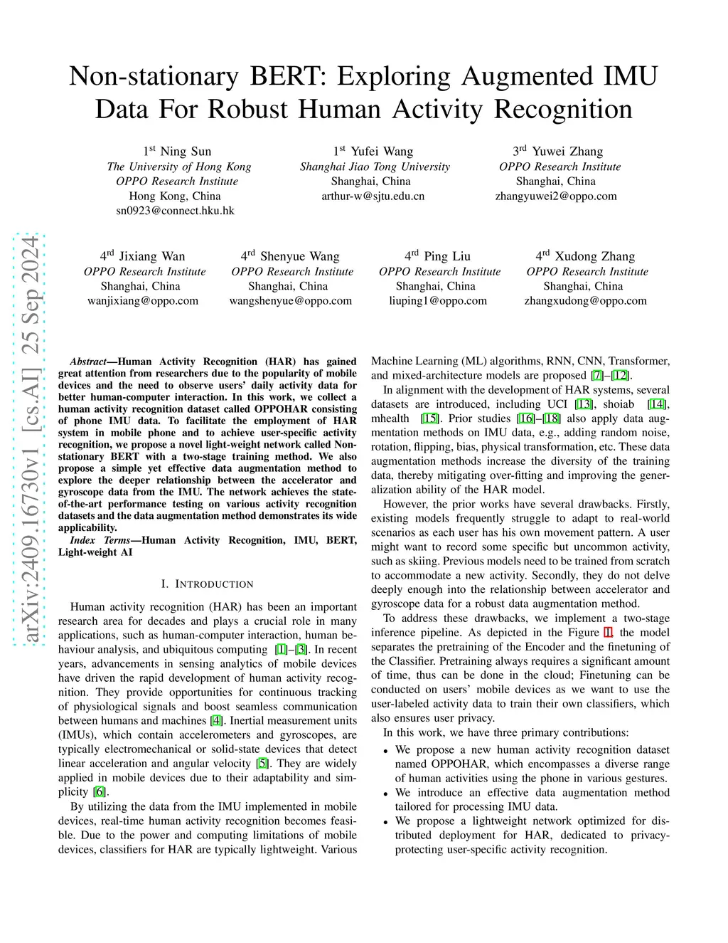 Human Activity Recognition (HAR) has gained great attention from researchers due to the popularity of mobile devices and the need to observe users' daily activity data for better human-computer interaction. In this work, we collect a human activity recognition dataset called OPPOHAR consisting of phone IMU data. To facilitate the employment of HAR system in mobile phone and to achieve user-specific activity recognition, we propose a novel light-weight network called Non-stationary BERT with a two-stage training method. We also propose a simple yet effective data augmentation method to explore the deeper relationship between the accelerator and gyroscope data from the IMU. The network achieves the state-of-the-art performance testing on various activity recognition datasets and the data augmentation method demonstrates its wide applicability.