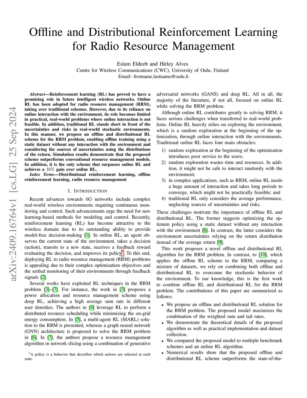 Offline and Distributional Reinforcement Learning for Radio Resource Management
