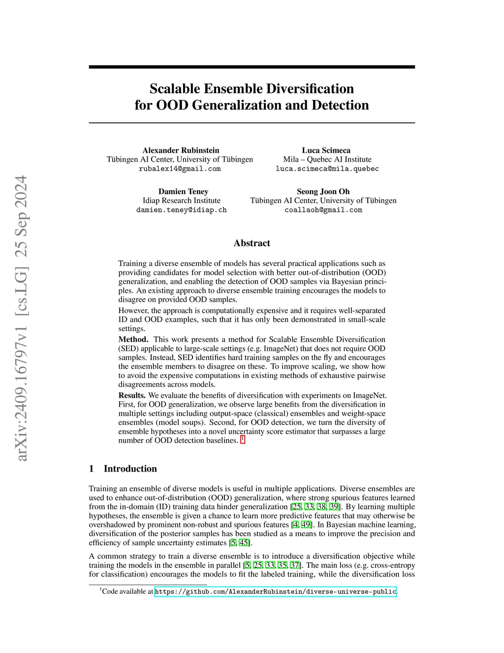 Training a diverse ensemble of models has several practical applications such as providing candidates for model selection with better out-of-distribution (OOD) generalization, and enabling the detection of OOD samples via Bayesian principles. An existing approach to diverse ensemble training encourages the models to disagree on provided OOD samples. However, the approach is computationally expensive and it requires well-separated ID and OOD examples, such that it has only been demonstrated in small-scale settings. This work presents a method for Scalable Ensemble Diversification (SED) applicable to large-scale settings (e.g. ImageNet) that does not require OOD samples. Instead, SED identifies hard training samples on the fly and encourages the ensemble members to disagree on these. To improve scaling, we show how to avoid the expensive computations in existing methods of exhaustive pairwise disagreements across models. We evaluate the benefits of diversification with experiments on ImageNet. First, for OOD generalization, we observe large benefits from the diversification in multiple settings including output-space (classical) ensembles and weight-space ensembles (model soups). Second, for OOD detection, we turn the diversity of ensemble hypotheses into a novel uncertainty score estimator that surpasses a large number of OOD detection baselines. Code is available here: https://github.com/AlexanderRubinstein/diverse-universe-public.