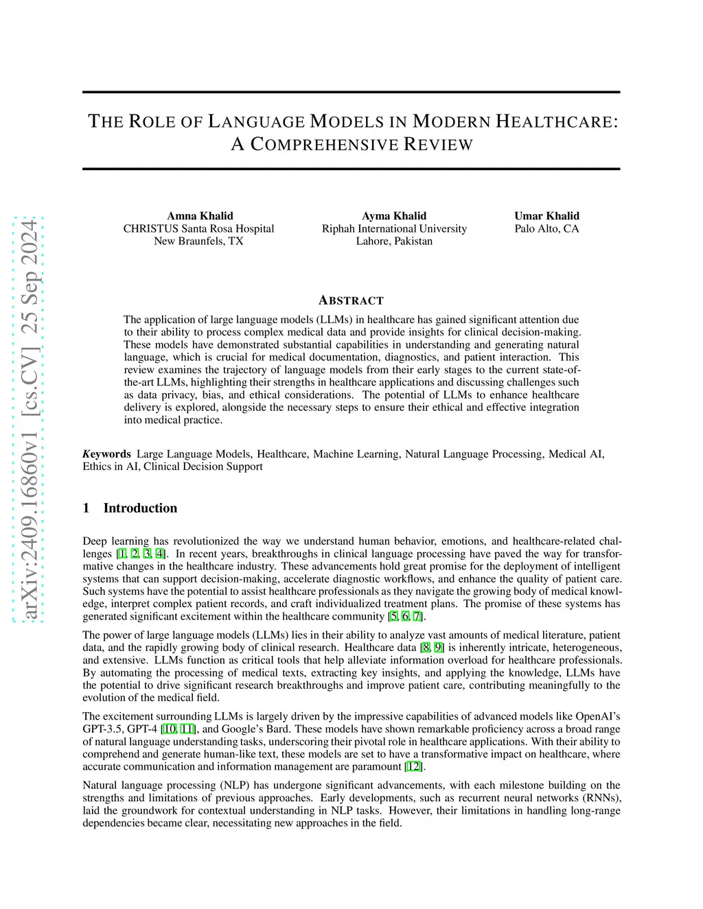 The Role of Language Models in Modern Healthcare: A Comprehensive Review