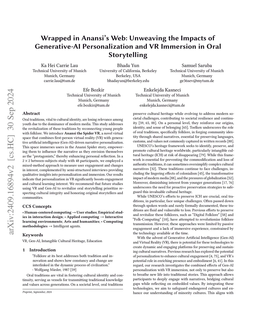Oral traditions, vital to cultural identity, are losing relevance among youth due to the dominance of modern media. This study addresses the revitalization of these traditions by reconnecting young people with folklore. We introduce Anansi the Spider VR, a novel virtual space that combines first-person virtual reality (VR) with generative artificial intelligence (Gen-AI)-driven narrative personalization. This space immerses users in the Anansi Spider story, empowering them to influence the narrative as they envision themselves as the `protagonists,' thereby enhancing personal reflection. In a 2 by 2 between-subjects study with 48 participants, we employed a mixed-method approach to measure user engagement and changes in interest, complemented by semi-structured interviews providing qualitative insights into personalization and immersion. Our results indicate that personalization in VR significantly boosts engagement and cultural learning interest. We recommend that future studies using VR and Gen-AI to revitalize oral storytelling prioritize respecting cultural integrity and honoring original storytellers and communities.