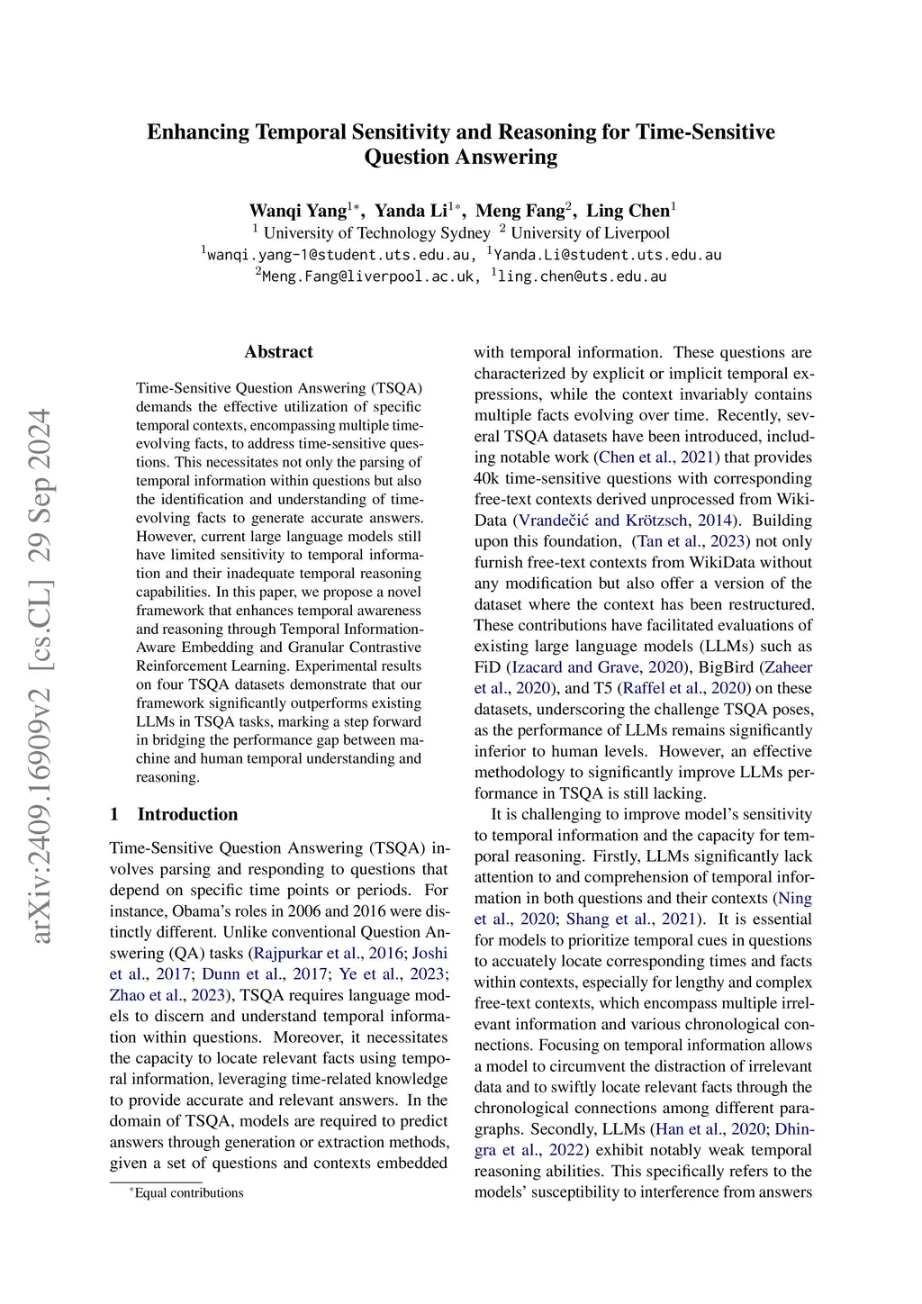Time-Sensitive Question Answering (TSQA) demands the effective utilization of specific temporal contexts, encompassing multiple time-evolving facts, to address time-sensitive questions. This necessitates not only the parsing of temporal information within questions but also the identification and understanding of time-evolving facts to generate accurate answers. However, current large language models still have limited sensitivity to temporal information and their inadequate temporal reasoning capabilities. In this paper, we propose a novel framework that enhances temporal awareness and reasoning through Temporal Information-Aware Embedding and Granular Contrastive Reinforcement Learning. Experimental results on four TSQA datasets demonstrate that our framework significantly outperforms existing LLMs in TSQA tasks, marking a step forward in bridging the performance gap between machine and human temporal understanding and reasoning.