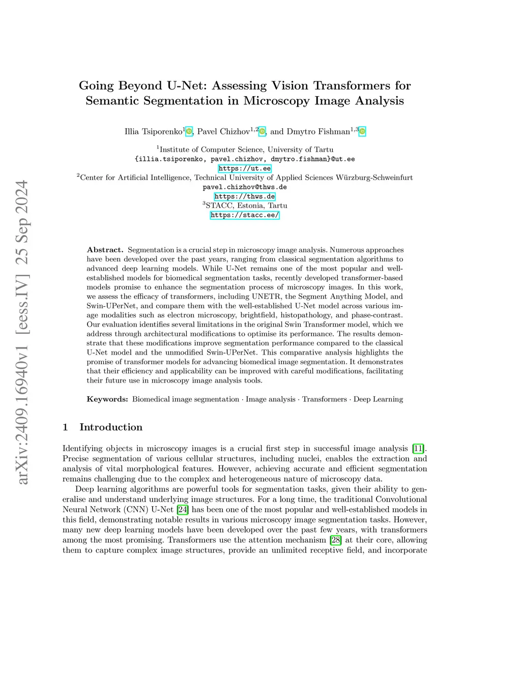 Segmentation is a crucial step in microscopy image analysis. Numerous approaches have been developed over the past years, ranging from classical segmentation algorithms to advanced deep learning models. While U-Net remains one of the most popular and well-established models for biomedical segmentation tasks, recently developed transformer-based models promise to enhance the segmentation process of microscopy images. In this work, we assess the efficacy of transformers, including UNETR, the Segment Anything Model, and Swin-UPerNet, and compare them with the well-established U-Net model across various image modalities such as electron microscopy, brightfield, histopathology, and phase-contrast. Our evaluation identifies several limitations in the original Swin Transformer model, which we address through architectural modifications to optimise its performance. The results demonstrate that these modifications improve segmentation performance compared to the classical U-Net model and the unmodified Swin-UPerNet. This comparative analysis highlights the promise of transformer models for advancing biomedical image segmentation. It demonstrates that their efficiency and applicability can be improved with careful modifications, facilitating their future use in microscopy image analysis tools.