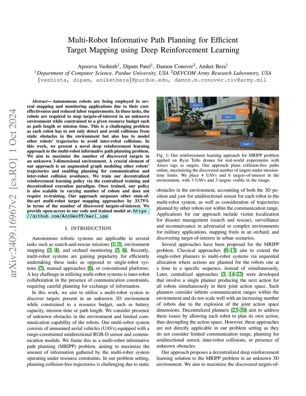 Autonomous robots are widely utilized for mapping and exploration tasks due to their cost-effectiveness. Multi-robot systems offer scalability and efficiency, especially in terms of the number of robots deployed in more complex environments. These tasks belong to the set of Multi-Robot Informative Path Planning (MRIPP) problems. In this paper, we propose a deep reinforcement learning approach for the MRIPP problem. We aim to maximize the number of discovered stationary targets in an unknown 3D environment while operating under resource constraints (such as path length). Here, each robot aims to maximize discovered targets, avoid unknown static obstacles, and prevent inter-robot collisions while operating under communication and resource constraints. We utilize the centralized training and decentralized execution paradigm to train a single policy neural network. A key aspect of our approach is our coordination graph that prioritizes visiting regions not yet explored by other robots. Our learned policy can be copied onto any number of robots for deployment in more complex environments not seen during training. Our approach outperforms state-of-the-art approaches by at least 26.2% in terms of the number of discovered targets while requiring a planning time of less than 2 sec per step. We present results for more complex environments with up to 64 robots and compare success rates against baseline planners. Our code and trained model are available at -this https URL