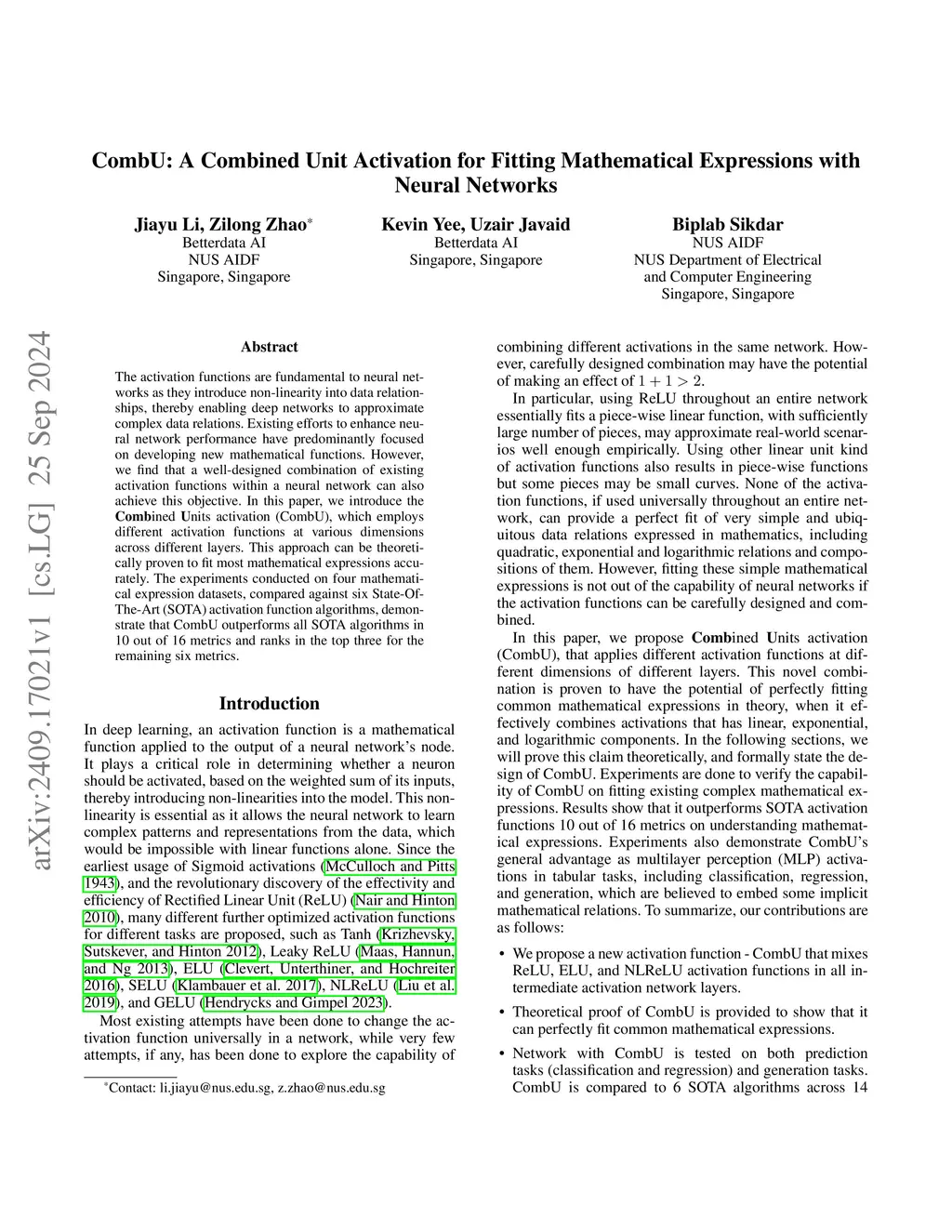 The activation functions are fundamental to neural networks as they introduce non-linearity into data relationships, thereby enabling deep networks to approximate complex data relations. Existing efforts to enhance neural network performance have predominantly focused on developing new mathematical functions. However, we find that a well-designed combination of existing activation functions within a neural network can also achieve this objective. In this paper, we introduce the Combined Units activation (CombU), which employs different activation functions at various dimensions across different layers. This approach can be theoretically proven to fit most mathematical expressions accurately. The experiments conducted on four mathematical expression datasets, compared against six State-Of-The-Art (SOTA) activation function algorithms, demonstrate that CombU outperforms all SOTA algorithms in 10 out of 16 metrics and ranks in the top three for the remaining six metrics.