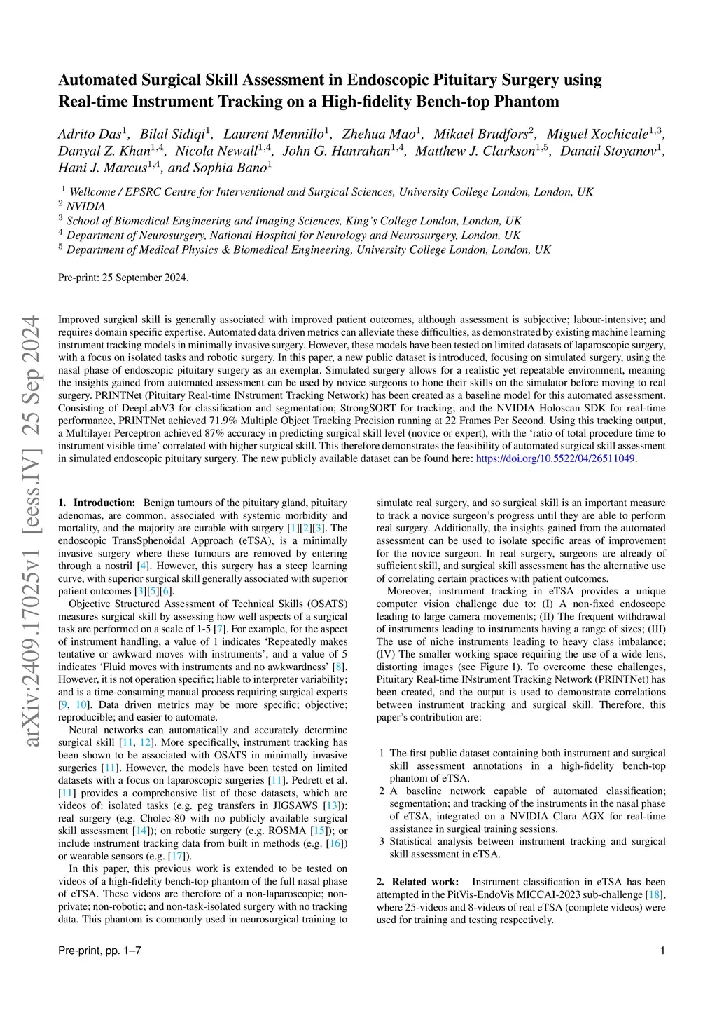 Improved surgical skill is generally associated with improved patient outcomes, although assessment is subjective; labour-intensive; and requires domain specific expertise. Automated data driven metrics can alleviate these difficulties, as demonstrated by existing machine learning instrument tracking models in minimally invasive surgery. However, these models have been tested on limited datasets of laparoscopic surgery, with a focus on isolated tasks and robotic surgery. In this paper, a new public dataset is introduced, focusing on simulated surgery, using the nasal phase of endoscopic pituitary surgery as an exemplar. Simulated surgery allows for a realistic yet repeatable environment, meaning the insights gained from automated assessment can be used by novice surgeons to hone their skills on the simulator before moving to real surgery. PRINTNet (Pituitary Real-time INstrument Tracking Network) has been created as a baseline model for this automated assessment. Consisting of DeepLabV3 for classification and segmentation; StrongSORT for tracking; and the NVIDIA Holoscan SDK for real-time performance, PRINTNet achieved 71.9% Multiple Object Tracking Precision running at 22 Frames Per Second. Using this tracking output, a Multilayer Perceptron achieved 87% accuracy in predicting surgical skill level (novice or expert), with the "ratio of total procedure time to instrument visible time" correlated with higher surgical skill. This therefore demonstrates the feasibility of automated surgical skill assessment in simulated endoscopic pituitary surgery. The new publicly available dataset can be found here: https://doi.org/10.5522/04/26511049.