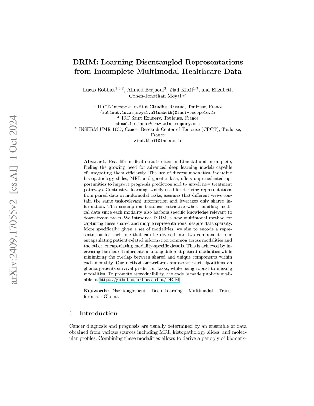 Real-life medical data is often multimodal and incomplete, fueling the growing need for advanced deep learning models capable of integrating them efficiently. The use of diverse modalities, including histopathology slides, MRI, and genetic data, offers unprecedented opportunities to improve prognosis prediction and to unveil new treatment pathways. Contrastive learning, widely used for deriving representations from paired data in multimodal tasks, assumes that different views contain the same task-relevant information and leverages only shared information. This assumption becomes restrictive when handling medical data since each modality also harbors specific knowledge relevant to downstream tasks. We introduce DRIM, a new multimodal method for capturing these shared and unique representations, despite data sparsity. More specifically, given a set of modalities, we aim to encode a representation for each one that can be divided into two components: one encapsulating patient-related information common across modalities and the other, encapsulating modality-specific details. This is achieved by increasing the shared information among different patient modalities while minimizing the overlap between shared and unique components within each modality. Our method outperforms state-of-the-art algorithms on glioma patients survival prediction tasks, while being robust to missing modalities. To promote reproducibility, the code is made publicly available at https://github.com/Lucas-rbnt/DRIM