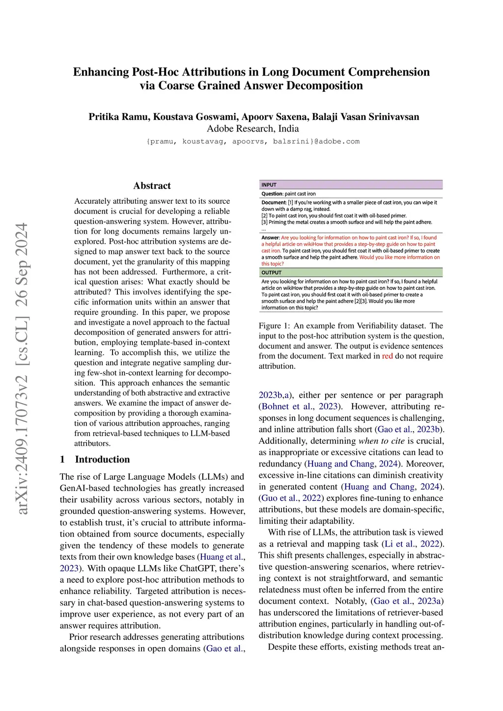 Accurately attributing answer text to its source document is crucial for developing a reliable question-answering system. However, attribution for long documents remains largely unexplored. Post-hoc attribution systems are designed to map answer text back to the source document, yet the granularity of this mapping has not been addressed. Furthermore, a critical question arises: What exactly should be attributed? This involves identifying the specific information units within an answer that require grounding. In this paper, we propose and investigate a novel approach to the factual decomposition of generated answers for attribution, employing template-based in-context learning. To accomplish this, we utilize the question and integrate negative sampling during few-shot in-context learning for decomposition. This approach enhances the semantic understanding of both abstractive and extractive answers. We examine the impact of answer decomposition by providing a thorough examination of various attribution approaches, ranging from retrieval-based techniques to LLM-based attributors.
