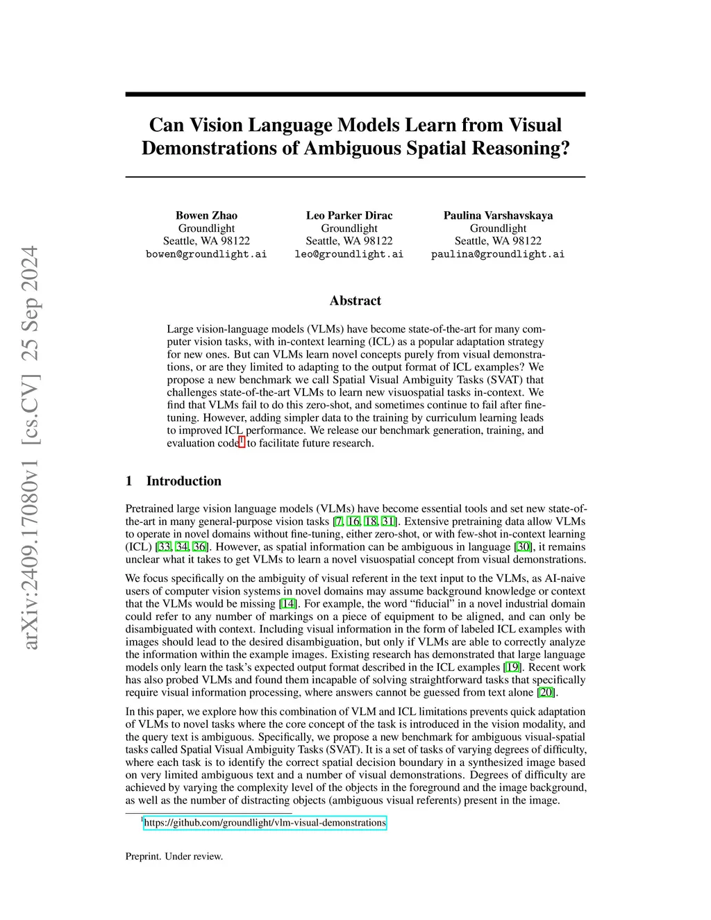 Large vision-language models (VLMs) have become state-of-the-art for many computer vision tasks, with in-context learning (ICL) as a popular adaptation strategy for new ones. But can VLMs learn novel concepts purely from visual demonstrations, or are they limited to adapting to the output format of ICL examples? We propose a new benchmark we call Spatial Visual Ambiguity Tasks (SVAT) that challenges state-of-the-art VLMs to learn new visuospatial tasks in-context. We find that VLMs fail to do this zero-shot, and sometimes continue to fail after finetuning. However, adding simpler data to the training by curriculum learning leads to improved ICL performance.