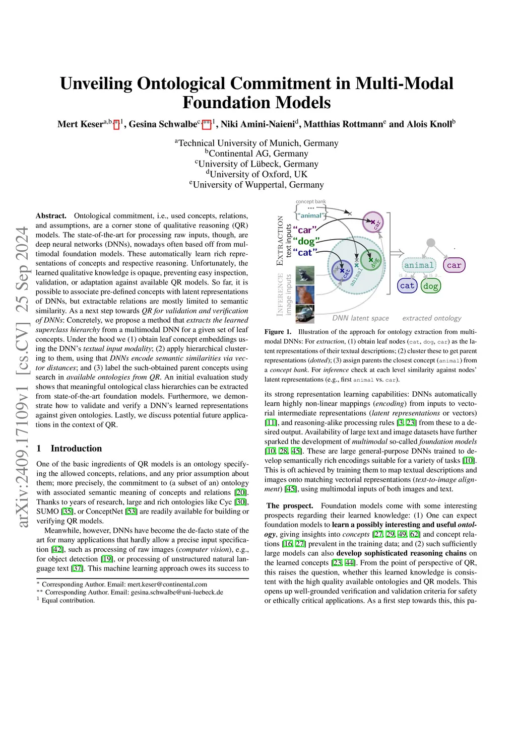 Ontological commitment, i.e., used concepts, relations, and assumptions, are a corner stone of qualitative reasoning (QR) models. The state-of-the-art for processing raw inputs, though, are deep neural networks (DNNs), nowadays often based off from multimodal foundation models. These automatically learn rich representations of concepts and respective reasoning. Unfortunately, the learned qualitative knowledge is opaque, preventing easy inspection, validation, or adaptation against available QR models. So far, it is possible to associate pre-defined concepts with latent representations of DNNs, but extractable relations are mostly limited to semantic similarity. As a next step towards QR for validation and verification of DNNs: Concretely, we propose a method that extracts the learned superclass hierarchy from a multimodal DNN for a given set of leaf concepts. Under the hood we (1) obtain leaf concept embeddings using the DNN's textual input modality; (2) apply hierarchical clustering to them, using that DNNs encode semantic similarities via vector distances; and (3) label the such-obtained parent concepts using search in available ontologies from QR. An initial evaluation study shows that meaningful ontological class hierarchies can be extracted from state-of-the-art foundation models. Furthermore, we demonstrate how to validate and verify a DNN's learned representations against given ontologies. Lastly, we discuss potential future applications in the context of QR.