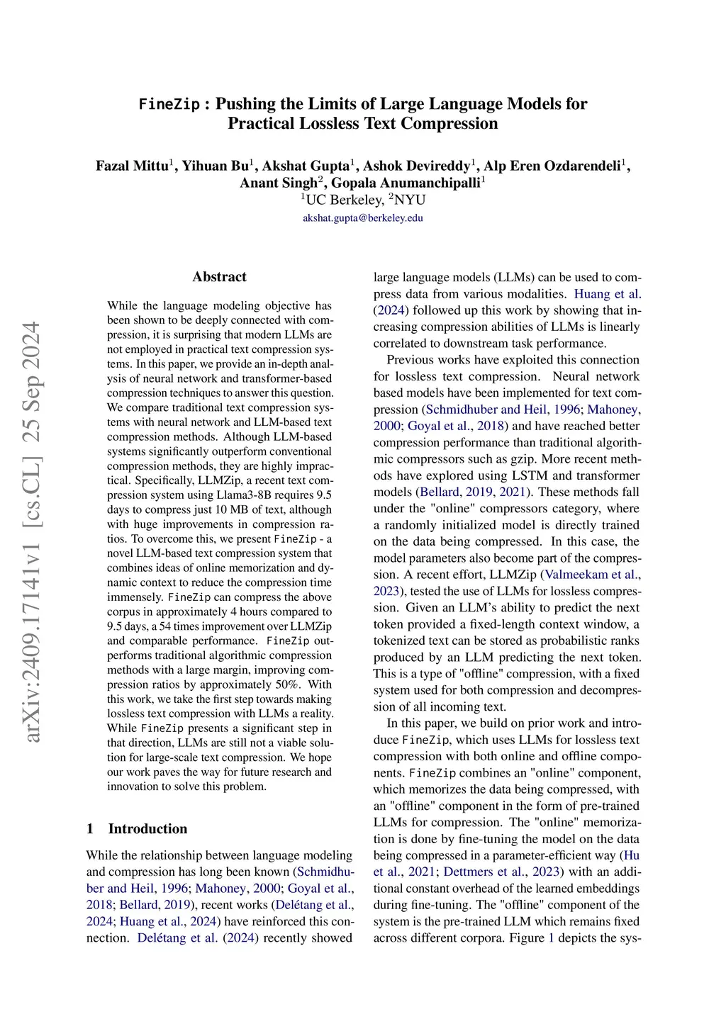 While the language modeling objective has been shown to be deeply connected with compression, it is surprising that modern LLMs are not employed in practical text compression systems. In this paper, we provide an in-depth analysis of neural network and transformer-based compression techniques to answer this question. We compare traditional text compression systems with neural network and LLM-based text compression methods. Although LLM-based systems significantly outperform conventional compression methods, they are highly impractical. Specifically, LLMZip, a recent text compression system using Llama3-8B requires 9.5 days to compress just 10 MB of text, although with huge improvements in compression ratios. To overcome this, we present FineZip - a novel LLM-based text compression system that combines ideas of online memorization and dynamic context to reduce the compression time immensely. FineZip can compress the above corpus in approximately 4 hours compared to 9.5 days, a 54 times improvement over LLMZip and comparable performance. FineZip outperforms traditional algorithmic compression methods with a large margin, improving compression ratios by approximately 50\%. With this work, we take the first step towards making lossless text compression with LLMs a reality. While FineZip presents a significant step in that direction, LLMs are still not a viable solution for large-scale text compression. We hope our work paves the way for future research and innovation to solve this problem.
