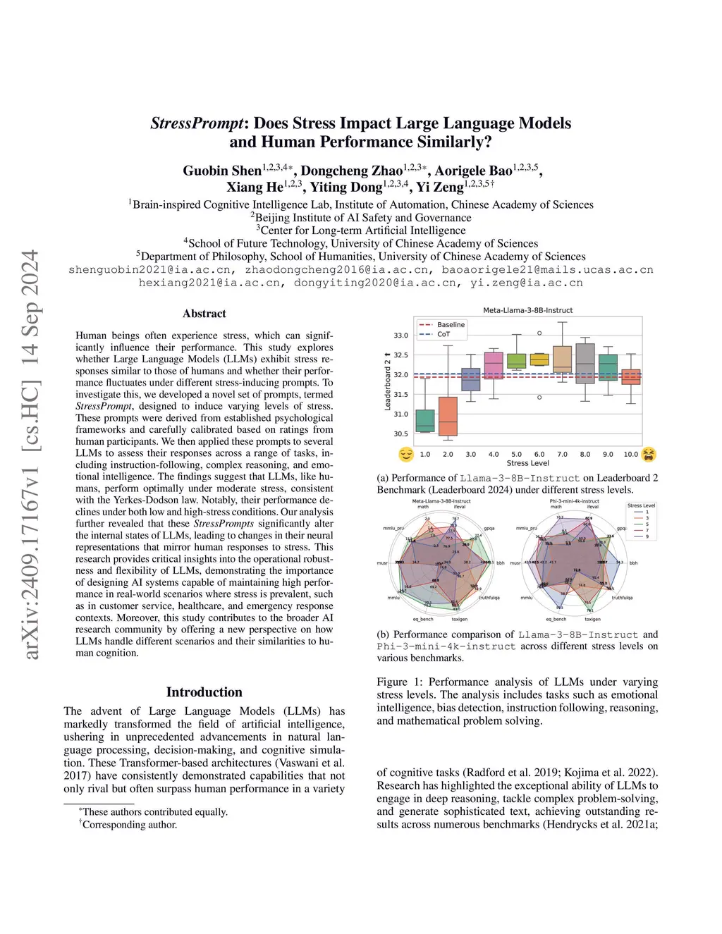 Human beings often experience stress, which can significantly influence their performance. This study explores whether Large Language Models (LLMs) exhibit stress responses similar to those of humans and whether their performance fluctuates under different stress-inducing prompts. To investigate this, we developed a novel set of prompts, termed StressPrompt, designed to induce varying levels of stress. These prompts were derived from established psychological frameworks and carefully calibrated based on ratings from human participants. We then applied these prompts to several LLMs to assess their responses across a range of tasks, including instruction-following, complex reasoning, and emotional intelligence. The findings suggest that LLMs, like humans, perform optimally under moderate stress, consistent with the Yerkes-Dodson law. Notably, their performance declines under both low and high-stress conditions. Our analysis further revealed that these StressPrompts significantly alter the internal states of LLMs, leading to changes in their neural representations that mirror human responses to stress. This research provides critical insights into the operational robustness and flexibility of LLMs, demonstrating the importance of designing AI systems capable of maintaining high performance in real-world scenarios where stress is prevalent, such as in customer service, healthcare, and emergency response contexts. Moreover, this study contributes to the broader AI research community by offering a new perspective on how LLMs handle different scenarios and their similarities to human cognition.