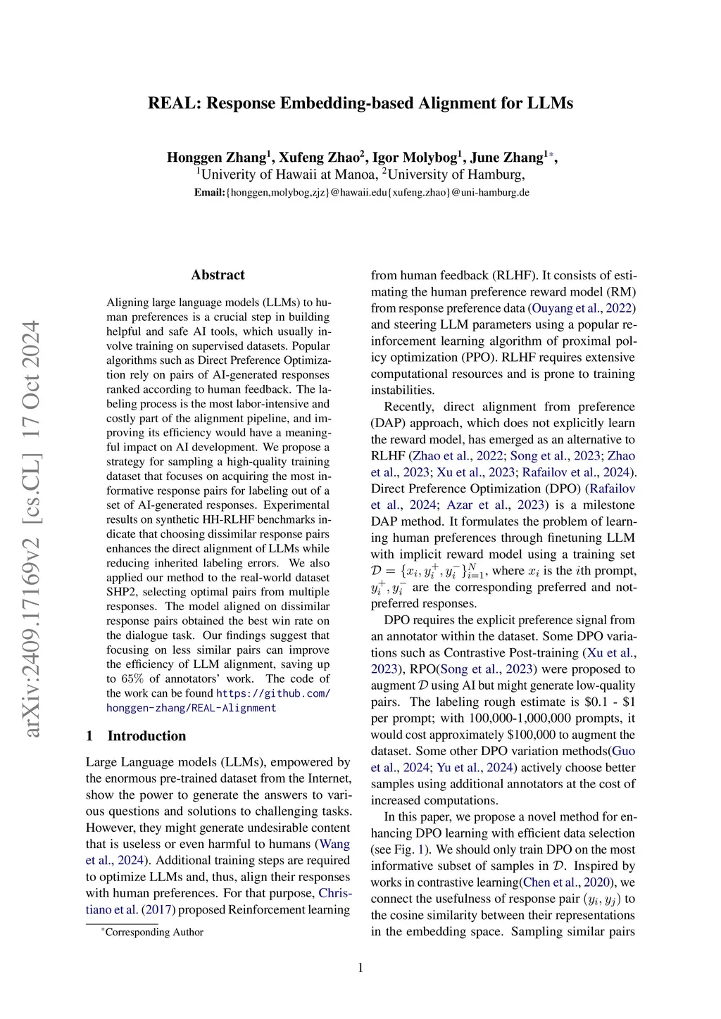 Aligning large language models (LLMs) to human preferences is a crucial step in building helpful and safe AI tools, which usually involve training on supervised datasets. Popular algorithms such as Direct Preference Optimization (DPO) rely on pairs of AI-generated responses ranked according to human annotation. The response pair annotation process might bring human bias. Building a correct preference dataset is the costly part of the alignment pipeline. To improve annotation efficiency and quality in the LLMs alignment, we propose REAL: Response Embedding-based Alignment for LLMs, a strategy for constructing a high-quality training dataset that focuses on acquiring the less ambiguous preference pairs for labeling out of a set of response candidates. Our selection process is based on the similarity of embedding responses independently of prompts, which guarantees the selection process in an off-policy setting, avoiding adaptively measuring the similarity during the training. Experimental results on real-world dataset SHP2 and synthetic HH-RLHF benchmarks indicate that choosing dissimilar response pairs enhances the direct alignment of LLMs while reducing inherited labeling errors. The model aligned with dissimilar response pairs obtained a better margin and win rate on the dialogue task. Our findings suggest that focusing on distinct pairs can reduce the label error and improve LLM alignment efficiency, saving up to of annotators' work.