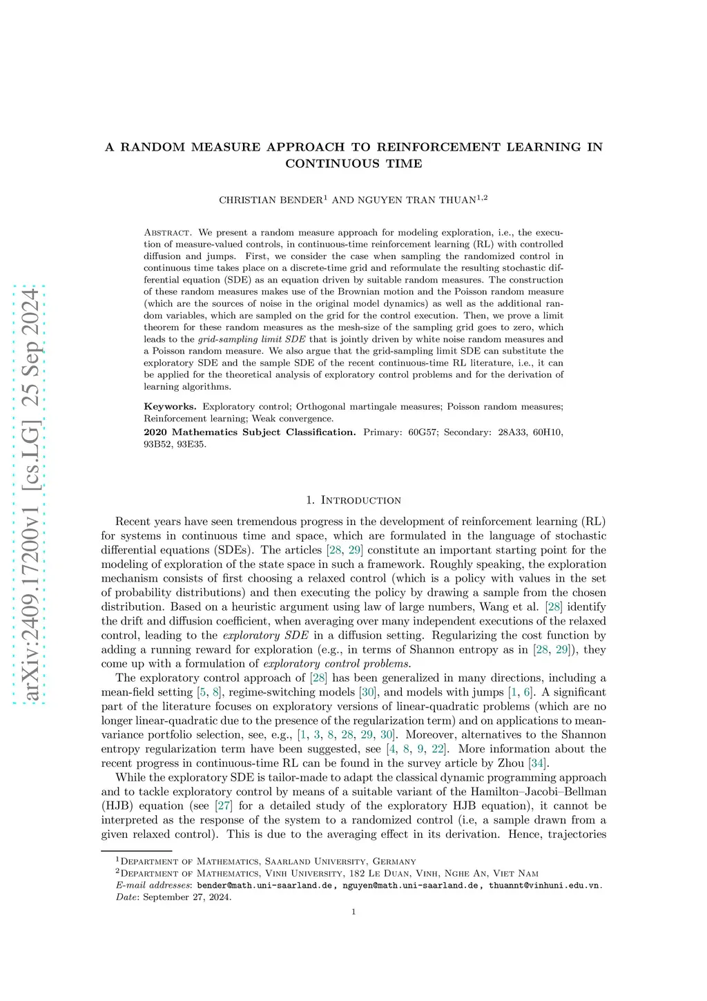 We present a random measure approach for modeling exploration, i.e., the execution of measure-valued controls, in continuous-time reinforcement learning (RL) with controlled diffusion and jumps. First, we consider the case when sampling the randomized control in continuous time takes place on a discrete-time grid and reformulate the resulting stochastic differential equation (SDE) as an equation driven by suitable random measures. The construction of these random measures makes use of the Brownian motion and the Poisson random measure (which are the sources of noise in the original model dynamics) as well as the additional random variables, which are sampled on the grid for the control execution. Then, we prove a limit theorem for these random measures as the mesh-size of the sampling grid goes to zero, which leads to the grid-sampling limit SDE that is jointly driven by white noise random measures and a Poisson random measure. We also argue that the grid-sampling limit SDE can substitute the exploratory SDE and the sample SDE of the recent continuous-time RL literature, i.e., it can be applied for the theoretical analysis of exploratory control problems and for the derivation of learning algorithms.